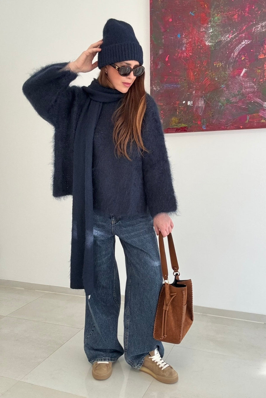 Dieser Mohair-Pullover in eleganten Navy überzeugt mit seinem weiteren Schnitt und leicht verkürztem Arm für einen modernen Look. Die Einheitsgröße passt bequem von 34 bis 42 und sorgt für vielseitigen Tragekomfort. Hergestellt aus 80 % feinstem Kid Mohair, 17 % Polyamid und 3 % Elastan, bietet er eine weiche, wärmende Qualität mit angenehmer Elastizität. Ideal für stilbewusste Frauen, die Komfort und zeitlose Eleganz schätzen. Das Modell auf dem Bild ist 164 cm groß und trägt Größe S.