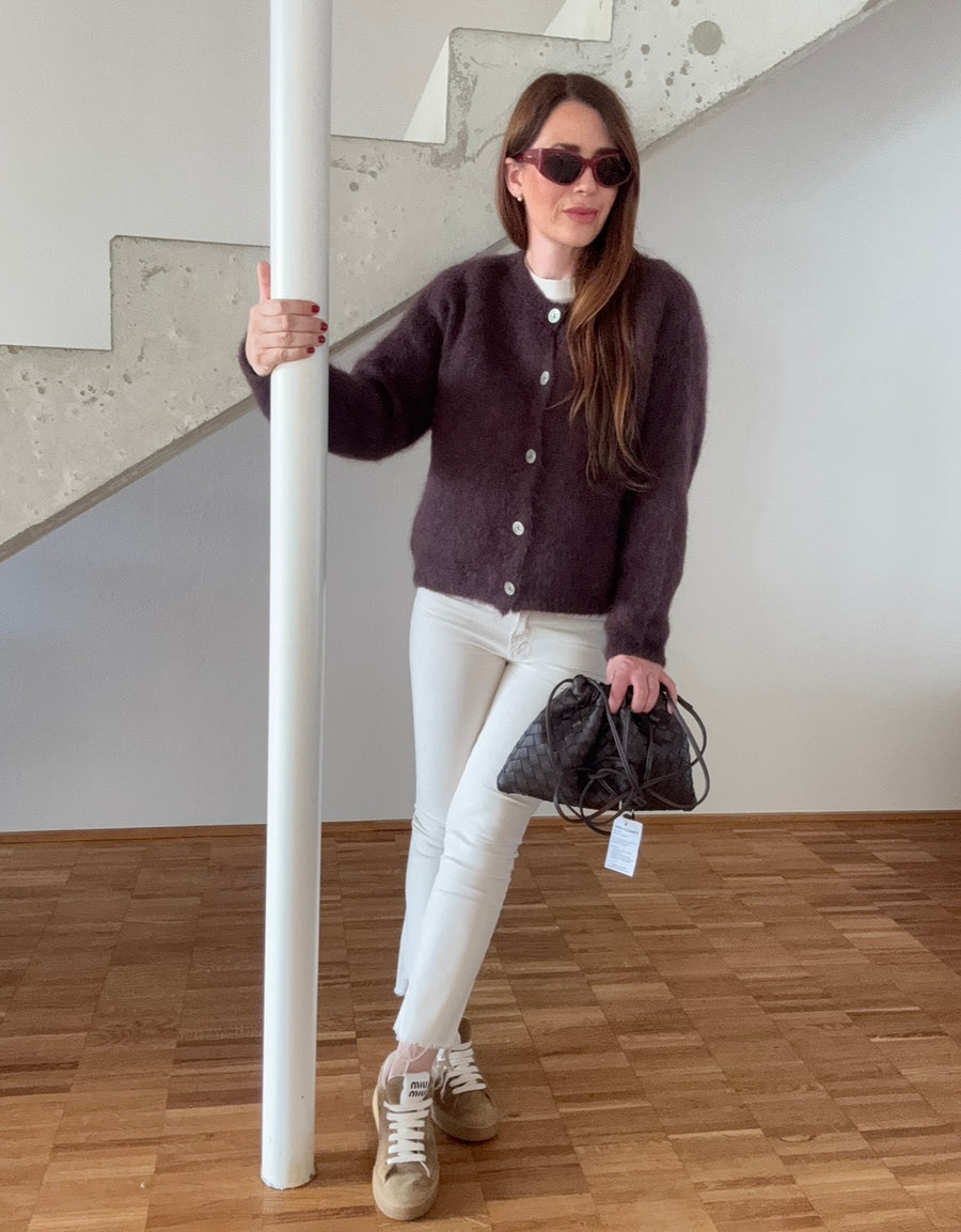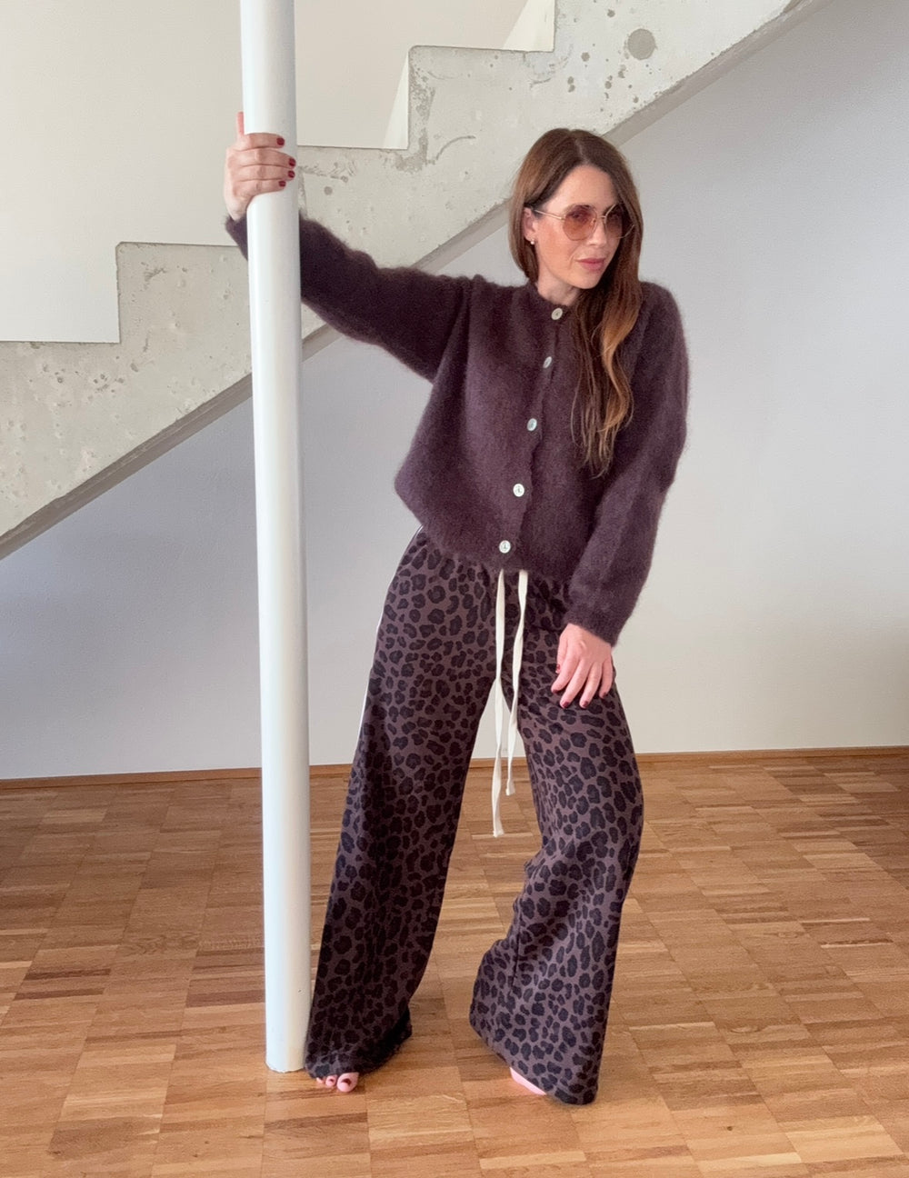 Dieser schokofarbene Mohair-Cardigan aus 80 % weichem Kid Mohair bietet ein luxuriöses Tragegefühl und angenehme Wärme. Die Einheitsgröße passt etwa von 34 bis 42 und sorgt für eine schmeichelhafte Passform. Ideal für stilbewusste Frauen, die Komfort und Eleganz in einem Kleidungsstück suchen. Das Modell auf dem Bild ist 164 cm groß und trägt Größe S.