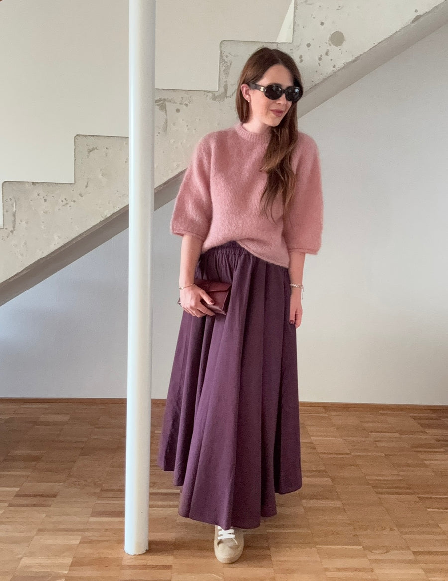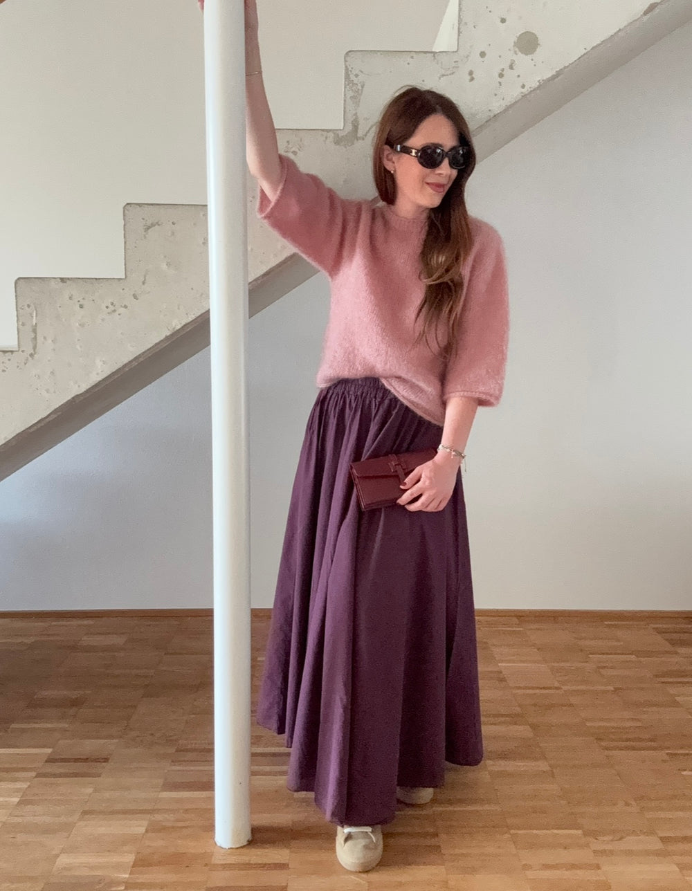 Dieser Maxi-Rock in elegantem Burgunder überzeugt mit seitlichen Taschen und einem bequemen Gummizug für optimalen Tragekomfort. Die Einheitsgröße passt etwa von 34 bis 42 und bietet vielseitige Kombinationsmöglichkeiten. Hergestellt aus 100% Baumwolle, sorgt er für ein angenehmes Hautgefühl und natürliche Atmungsaktivität. Perfekt für stilbewusste Frauen, die Komfort und Design schätzen. Die abgebildete Person ist 164 cm groß und trägt Größe S. Entdecken Sie dazu auch unser Mohairshirt im Shop für ein harmonisches Outfit.