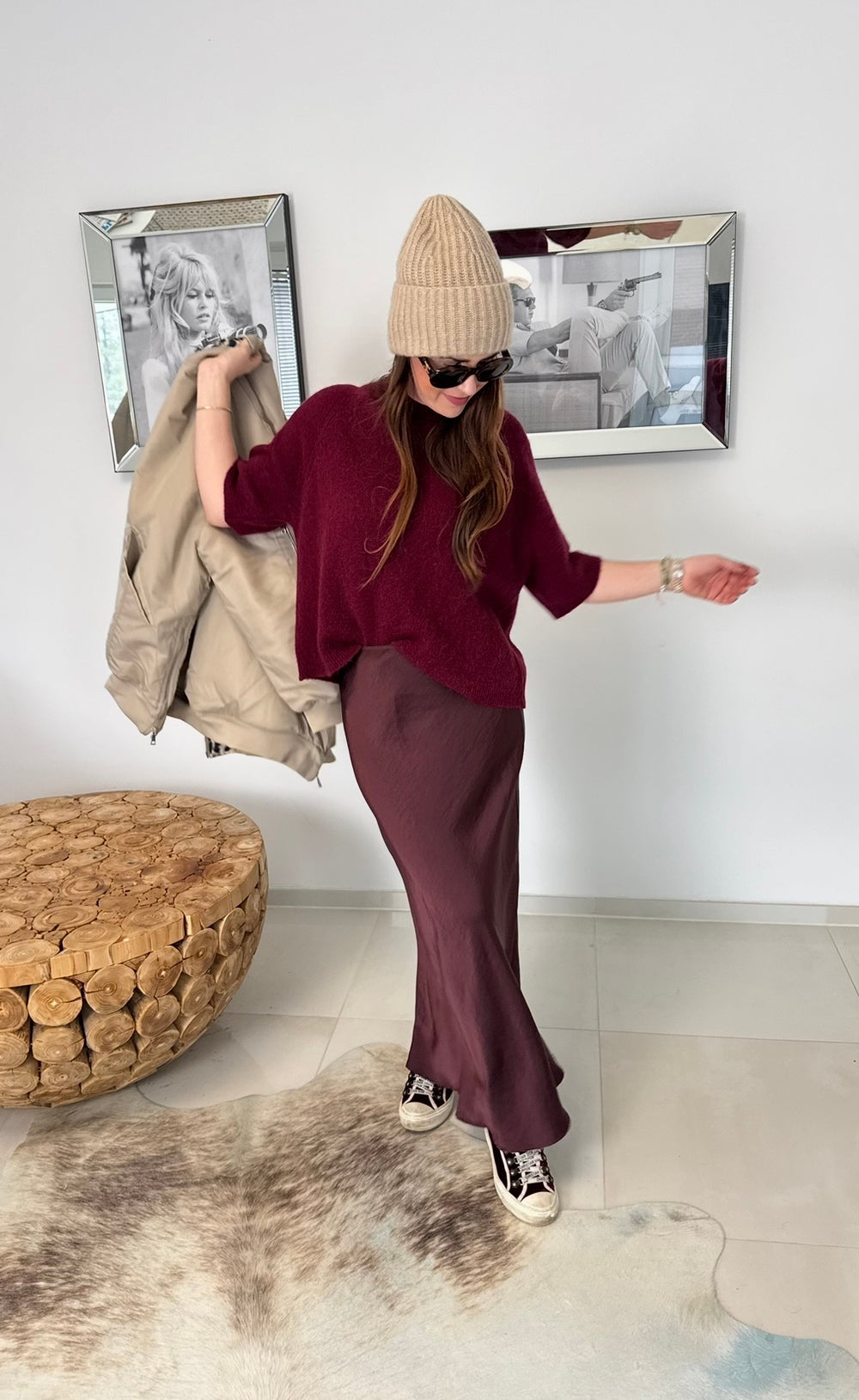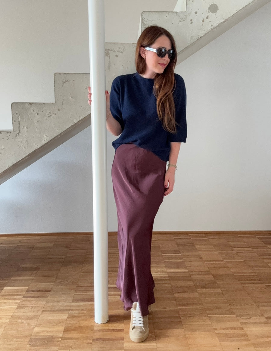 • Die Person auf dem Bild ist 164 cm groß und trägt Gr.XS- Material: 98% Polyester, 2% Elastan- Maxilänge- Satinqualität- Gummizug in der Taille