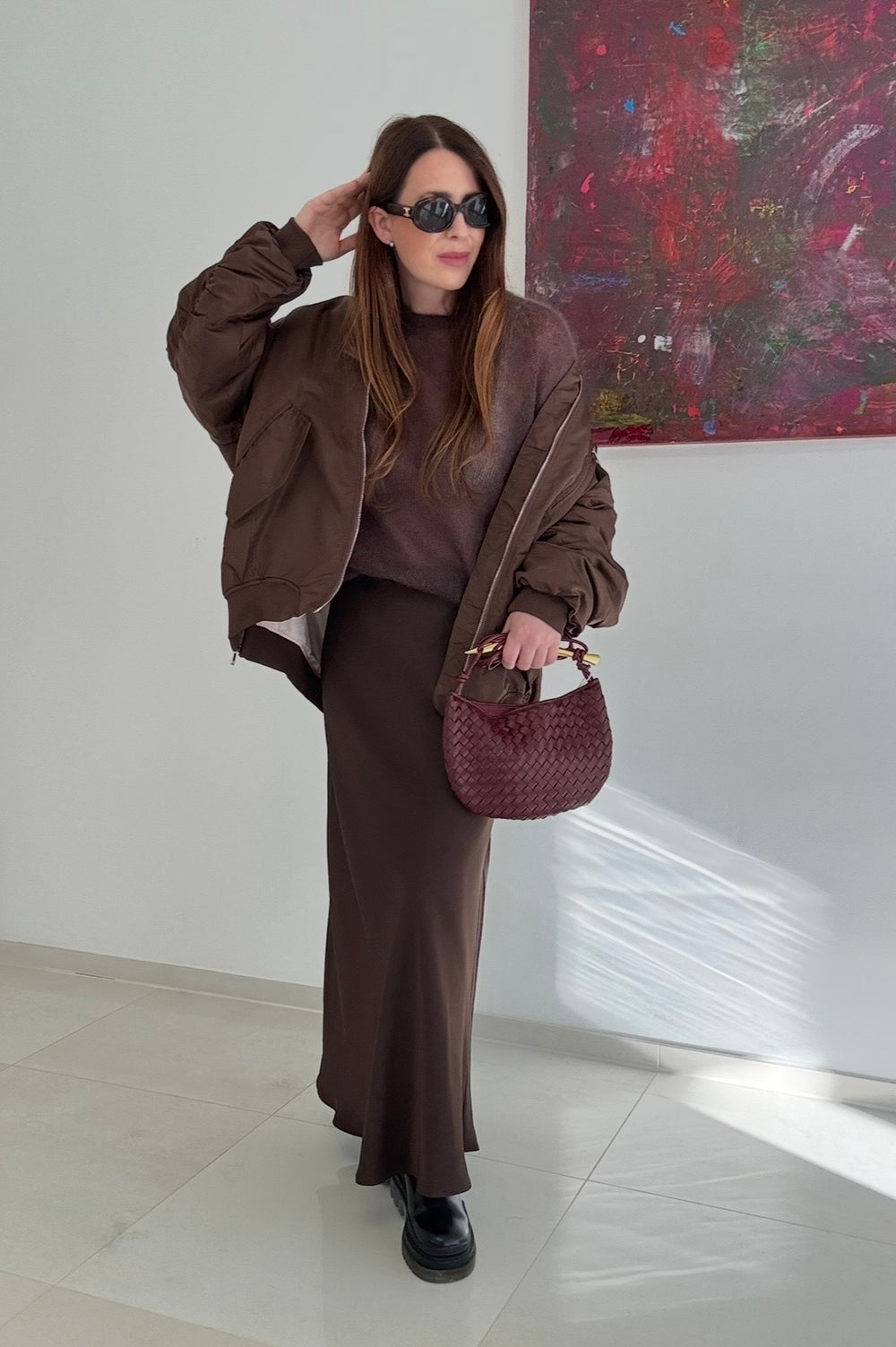 Dieser schicke Maxirock in schokoladenbrauner Satinqualität vereint Eleganz und Komfort. Der elastische Bund sorgt für eine perfekte Passform und das fließende Material aus 98 % Polyester und 2 % Elasthan bietet angenehmen Tragekomfort. Der Rock fällt größengerecht aus und hat eine Maxilänge – ideal, um stilvoll aufzutreten. Das Modell auf dem Bild ist 164 cm groß und trägt Größe S. Ein Must-have für trendbewusste Outfits!