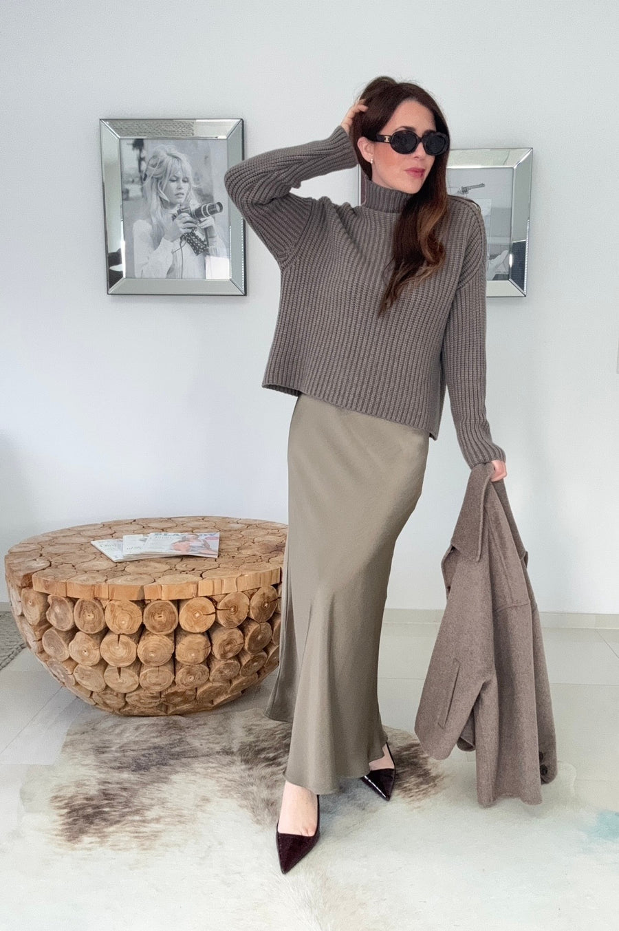 • Die Person auf dem Bild ist 164 cm groß und trägt Gr.XS- Material: 98% Polyester, 2% Elastan- Maxilänge- Satinqualität- Gummizug in der Taille