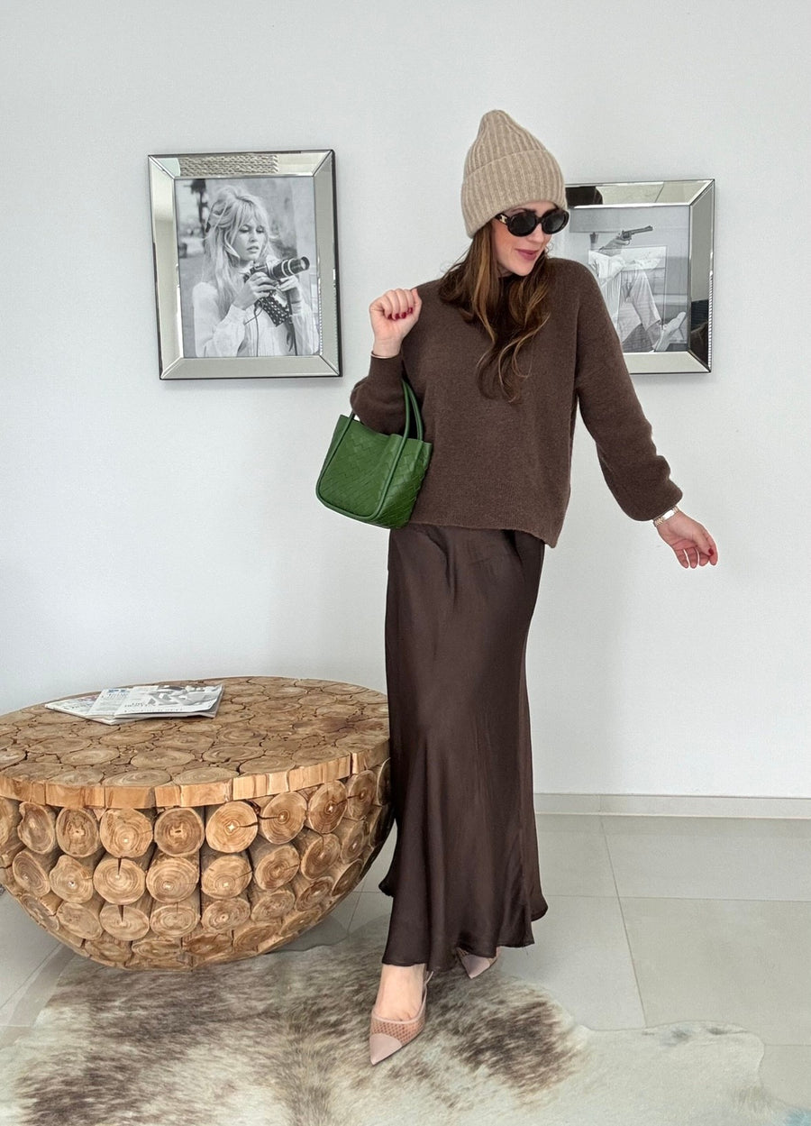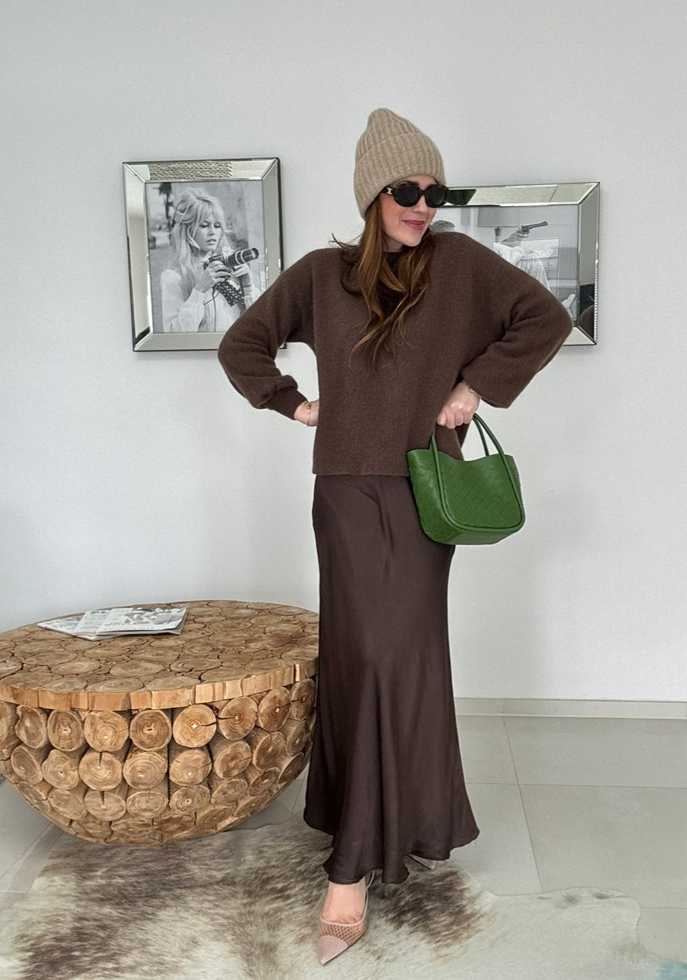 • Hier kombiniert zum Alpaka-Pullover in Schoko