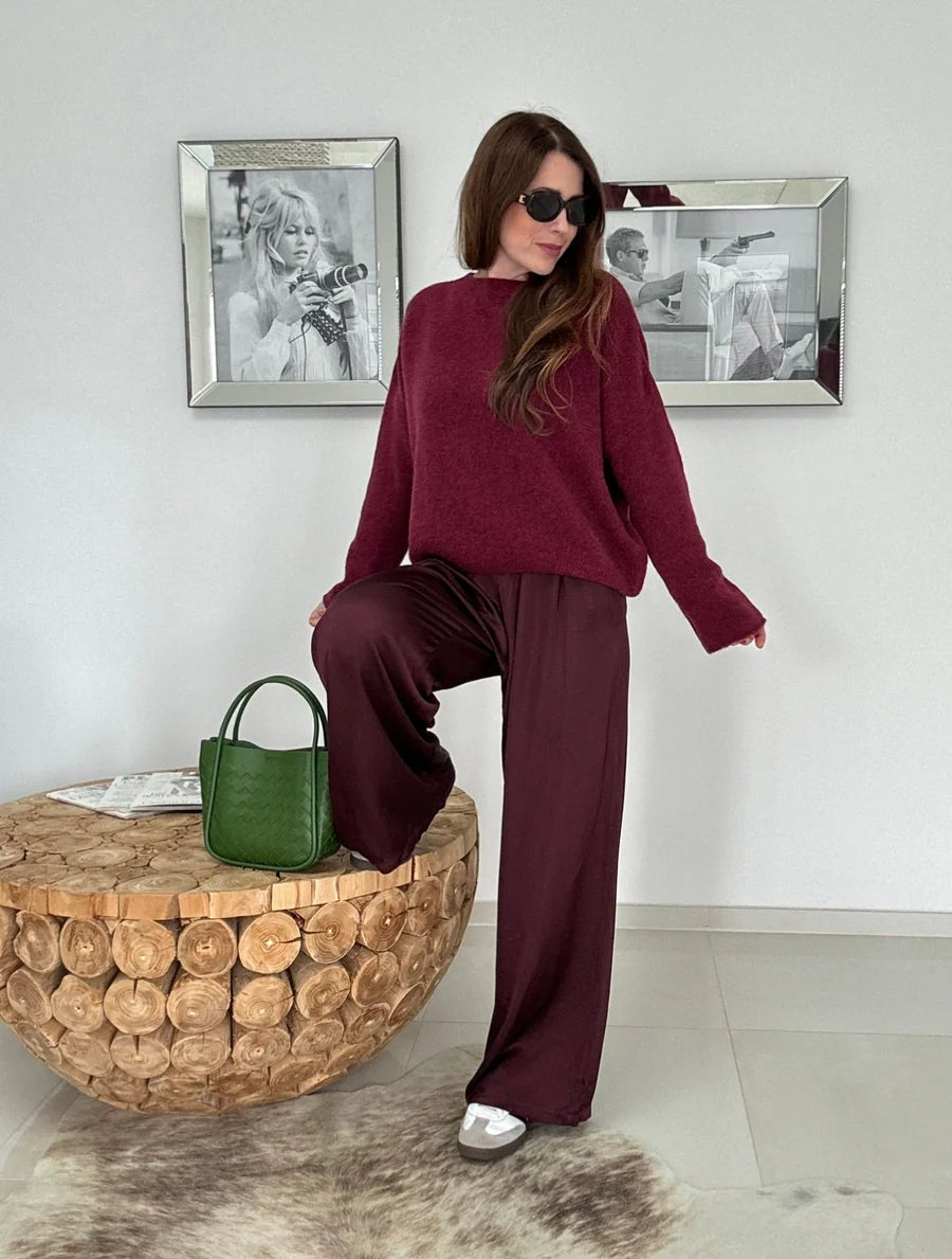 Diese elegante Satinhose in angesagtem Bordeaux überzeugt durch ihre super angenehme, luftige Qualität aus Seide und Viskose. Vielseitig kombinierbar und absolut im Trend, passt sie sich dank Einheitsgröße 34-40 jedem Stil an. Perfekt abgestimmt mit unserem Baby-Alpaka Pullover, vereint sie Komfort und modische Raffinesse für jeden Anlass. Ideal für alle, die Wert auf Luxus und Vielseitigkeit legen.