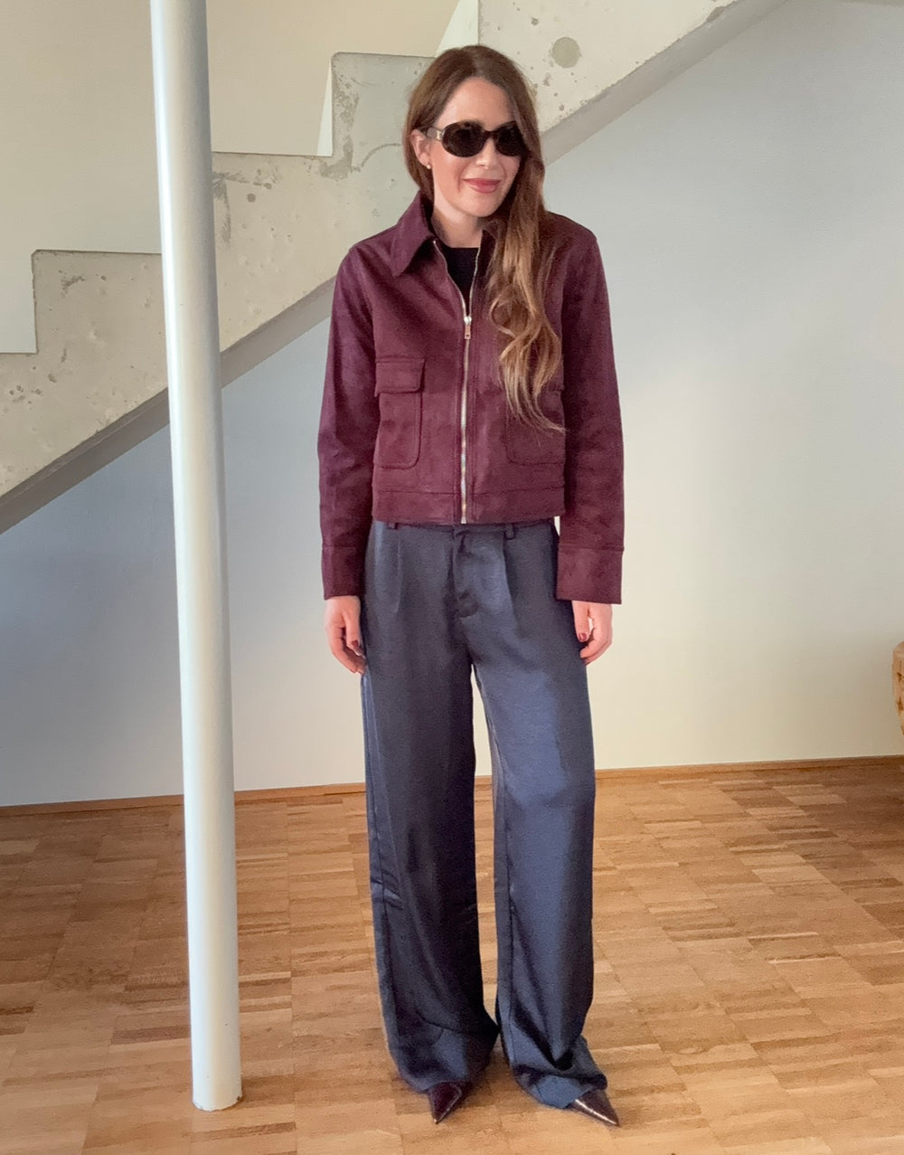 Diese verkürzte Jacke in elegantem Burgunder besticht durch ihren kastigen Schnitt und praktische aufgesetzte Taschen. Der Reißverschluss sorgt für einen modernen Look und einfachen Verschluss. Ideal für stilbewusste Frauen, die eine trendige und zugleich vielseitige Jacke suchen. Bei 164 cm Körpergröße passt die Größe S/M perfekt.