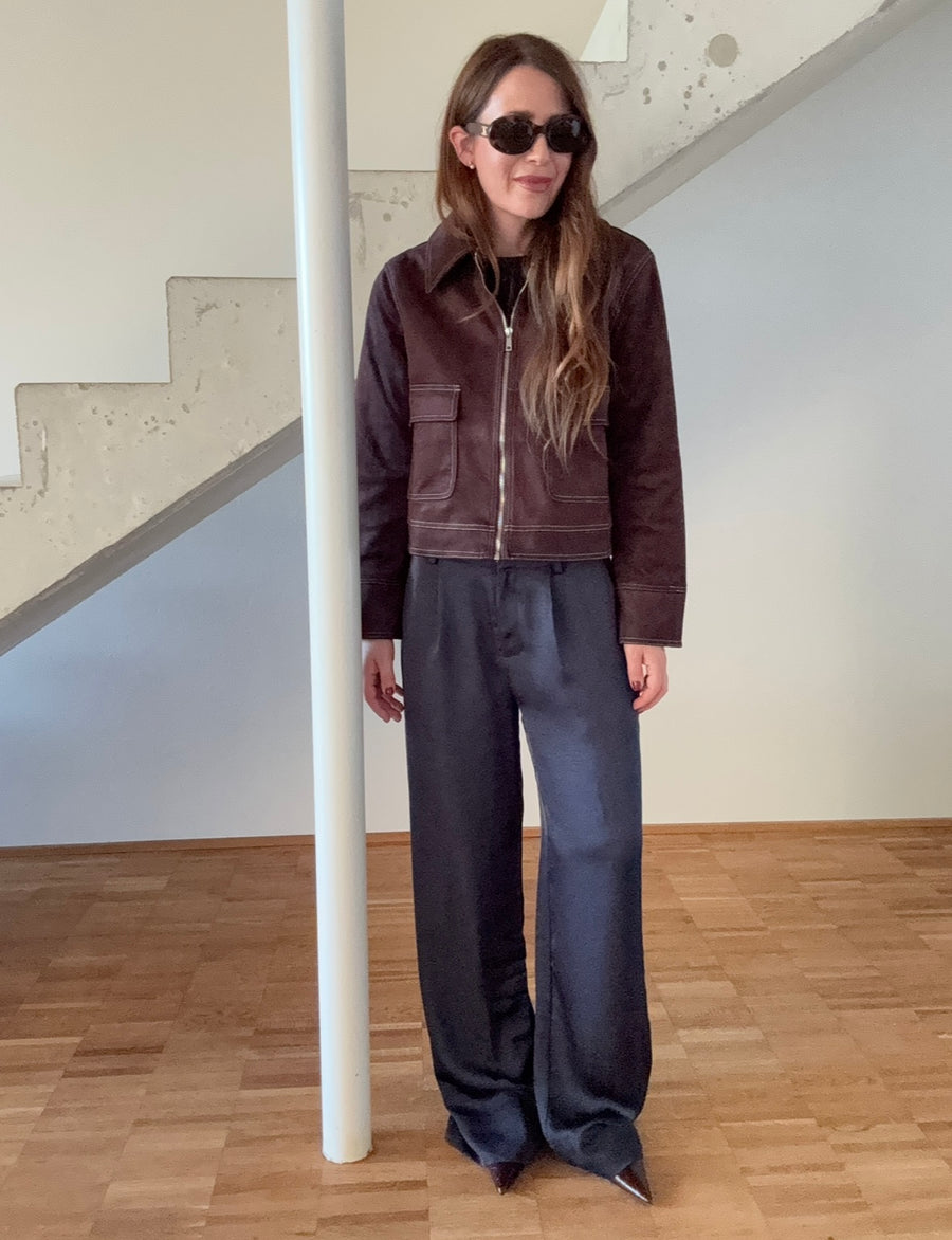 Diese verkürzte Jacke in elegantem Schoko besticht durch ihren kastigen Schnitt und praktische aufgesetzte Taschen. Der Reißverschluss sorgt für einen modernen Look und einfachen Verschluss. Ideal für stilbewusste Frauen, die eine trendige und zugleich vielseitige Jacke suchen. Bei 164 cm Körpergröße passt die Größe S/M perfekt.