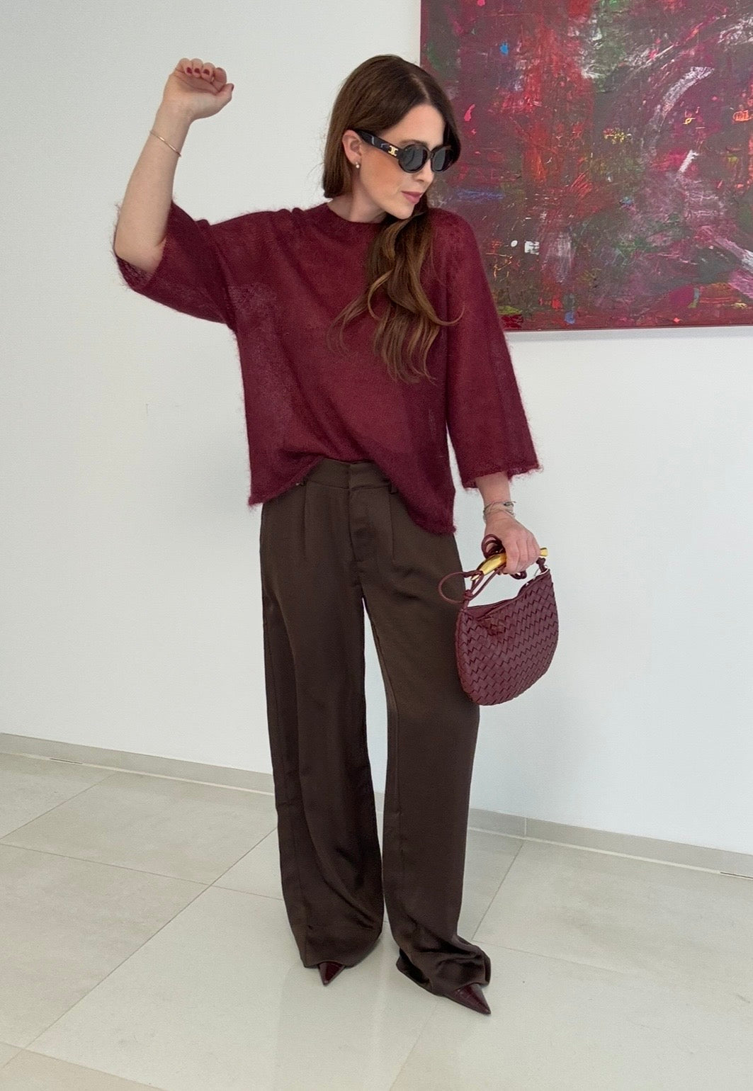 Dieses dünne Mohair-Shirt in edlem Burgunder bietet ein besonders angenehmes Tragegefühl dank der hochwertigen Mischung aus 70 % Kidmohair und 30 % Polyamid. Der 3/4-Arm-Schnitt sorgt für vielseitigen Komfort, während die Einheitsgröße von ca. 34–42 eine perfekte Passform für verschiedene Figuren ermöglicht. Ideal für stilbewusste Frauen, die elegante Leichtigkeit und wärmende Weichheit schätzen. Die abgebildete Person ist 164 cm groß und trägt Größe S.