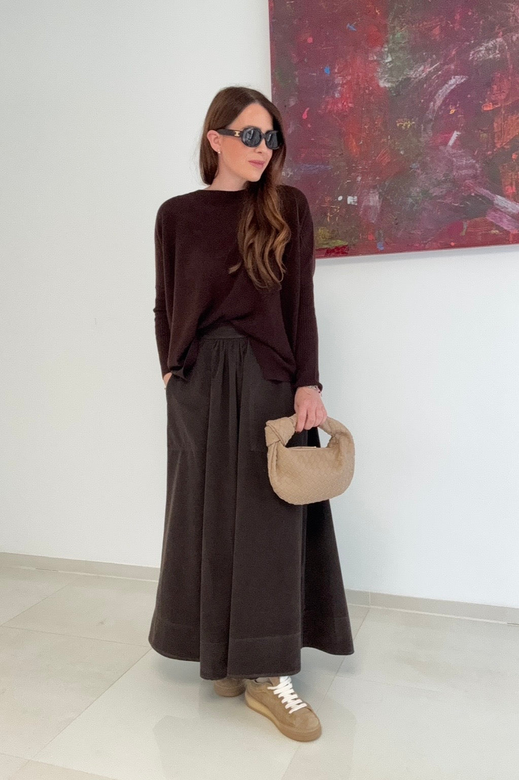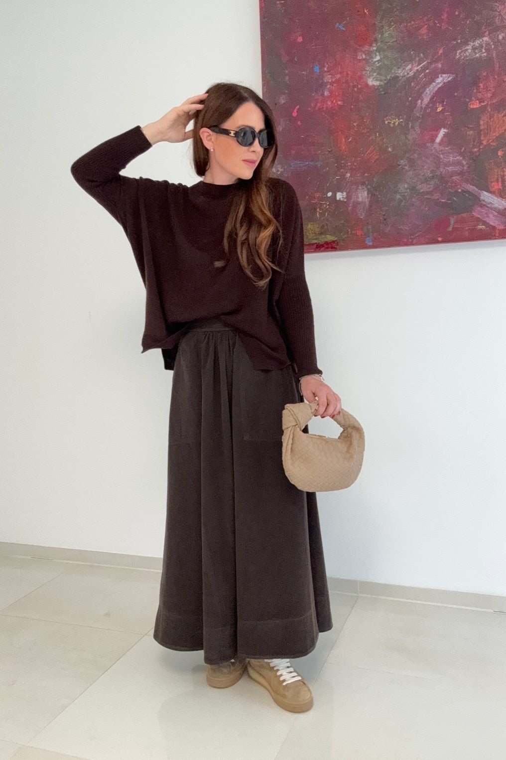 Genießen Sie den ultimativen Komfort mit diesem super soften Oversize-Pullover in warmem Maroneton. Die hochwertige Mischung aus 50 % Kaschmir und 50 % Merinowolle sorgt für unvergleichliche Wärme und ein angenehm leichtes Tragegefühl. Die Einheitsgröße passt bequem von 34 bis 42 und schmeichelt jeder Silhouette. Ein Must-have für stilbewusste Frauen, die keine Kompromisse bei Komfort und Eleganz eingehen wollen. Die abgebildete Person ist 164 cm groß und trägt Größe S.