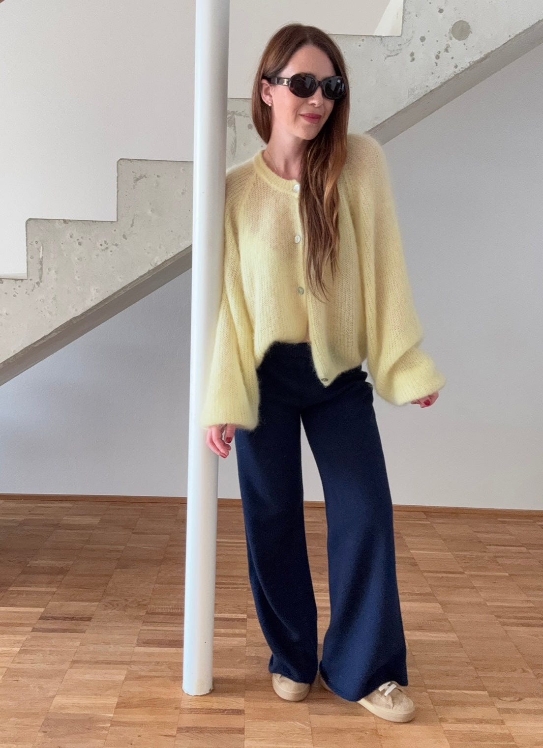 Dieser buttergelbe Mohair-Cardigan vereint luxuriöse Weichheit mit stilvoller Vielseitigkeit. Hergestellt aus 80% Kid-Mohair und 30% Polyamid, bietet er angenehme Wärme bei leichtem Tragegefühl. Der klassische Rundhalsausschnitt und die Einheitsgröße von etwa 34 bis 42 sorgen für eine schmeichelhafte Passform. Perfekt, um jedem Outfit einen eleganten Farbakzent zu verleihen und gleichzeitig Komfort zu genießen. Ideal für modebewusste Frauen, die Wert auf Qualität und zeitlose Eleganz legen.