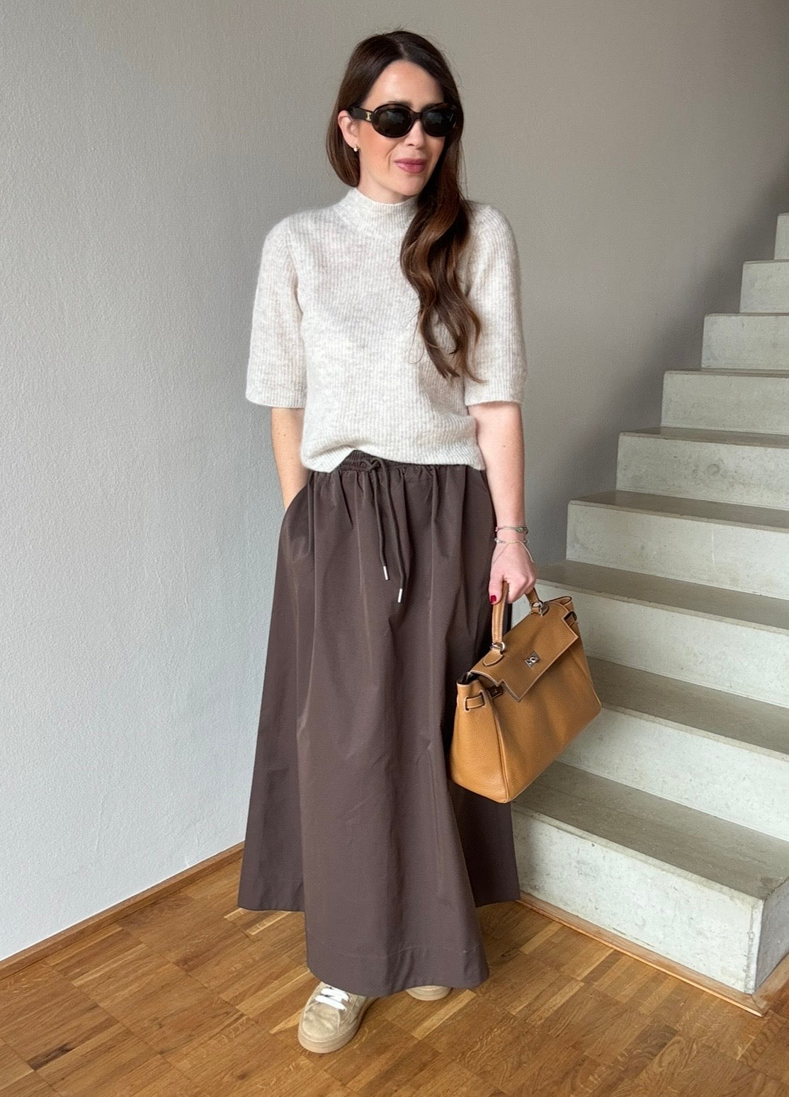 Dieser schokoladenbraune Rock mit praktischem Tunnelzug und flexiblem Gummizug passt sich dank Einheitsgröße etwa 34-42 perfekt an Ihre Figur an. Aus weicher Baumwolle gefertigt, bietet er angenehmen Tragekomfort für jeden Tag. Mit seinem vielseitigen Schnitt ist er ideal für entspannte Looks und lässt sich mühelos kombinieren. Die abgebildete Person ist 164 cm groß und trägt Größe S, was die perfekte Passform unterstreicht. Genießen Sie Komfort und Stil in einem.