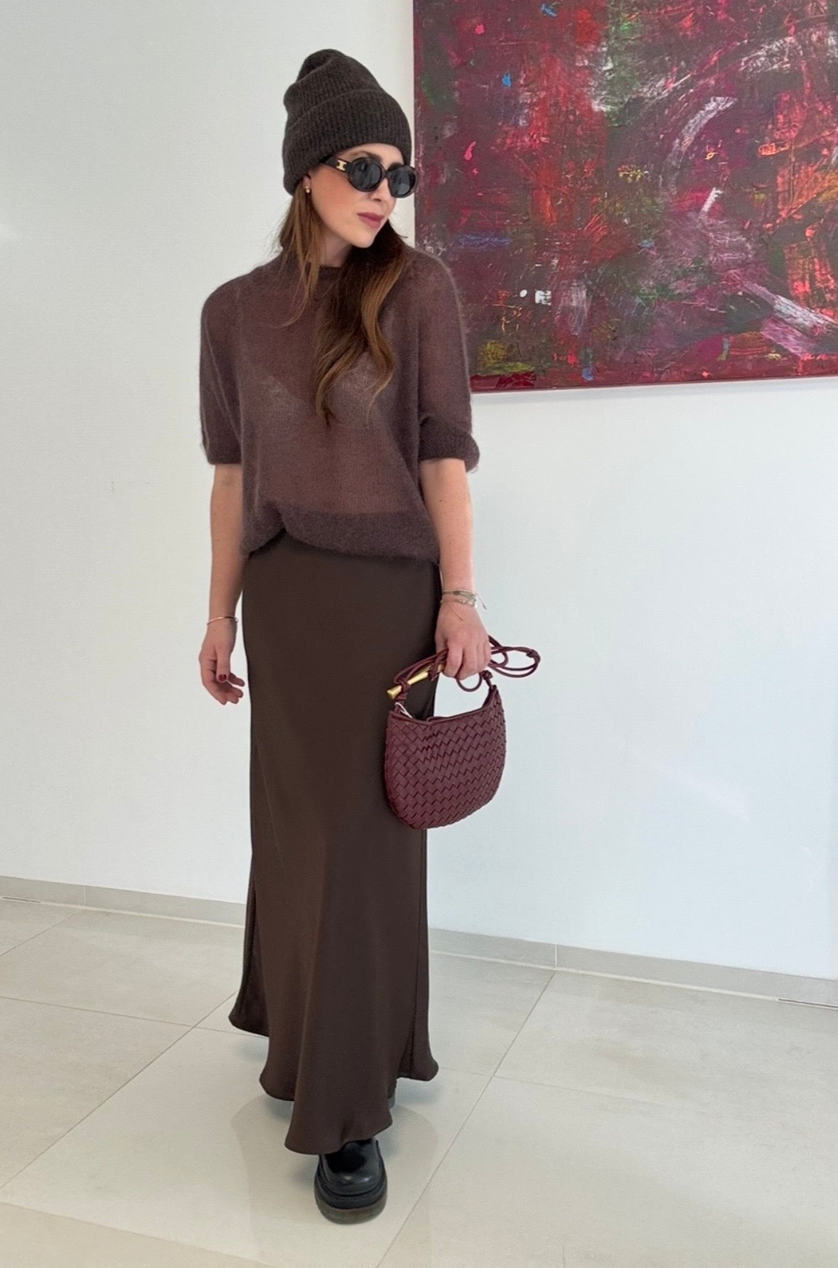 Dieser schicke Maxirock in schokoladenbrauner Satinqualität vereint Eleganz und Komfort. Der elastische Bund sorgt für eine perfekte Passform und das fließende Material aus 98 % Polyester und 2 % Elasthan bietet angenehmen Tragekomfort. Der Rock fällt größengerecht aus und hat eine Maxilänge – ideal, um stilvoll aufzutreten. Das Modell auf dem Bild ist 164 cm groß und trägt Größe S. Ein Must-have für trendbewusste Outfits!