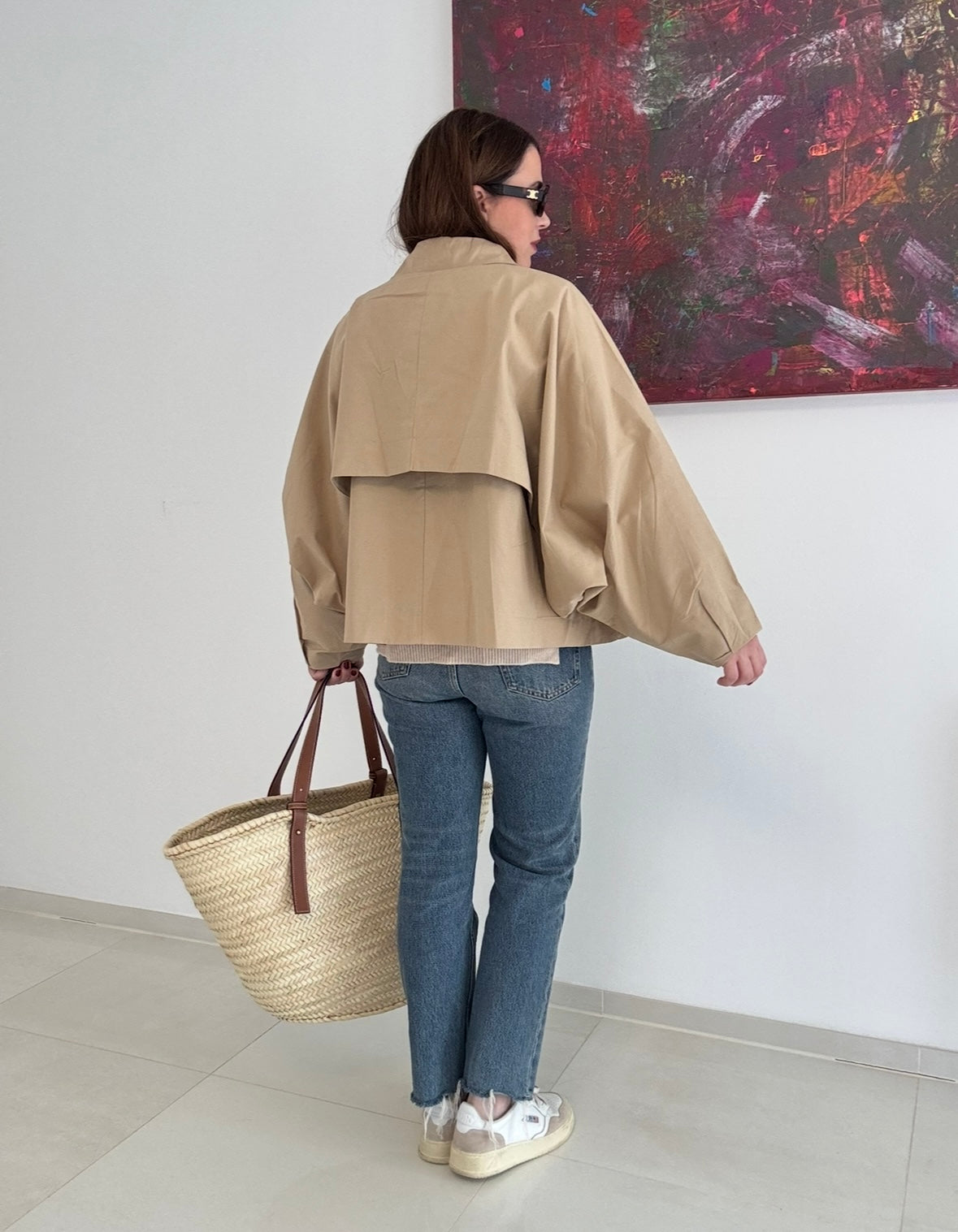 Diese beige Trenchjacke besticht durch ihren modernen, verkürzten Schnitt und die weiten Ärmel, die für einen auffälligen Look sorgen. Aus 100% Baumwolle gefertigt, bietet sie angenehmen Tragekomfort und atmungsaktive Leichtigkeit. Mit einer Länge von etwa 59-60 cm passt sie sich vielseitig an und ist in Einheitsgröße von ca. 34-40 erhältlich – ideal für stilbewusste Frauen, die Komfort und Eleganz verbinden möchten. Das Modell auf dem Bild ist 164 cm groß und trägt Größe S.