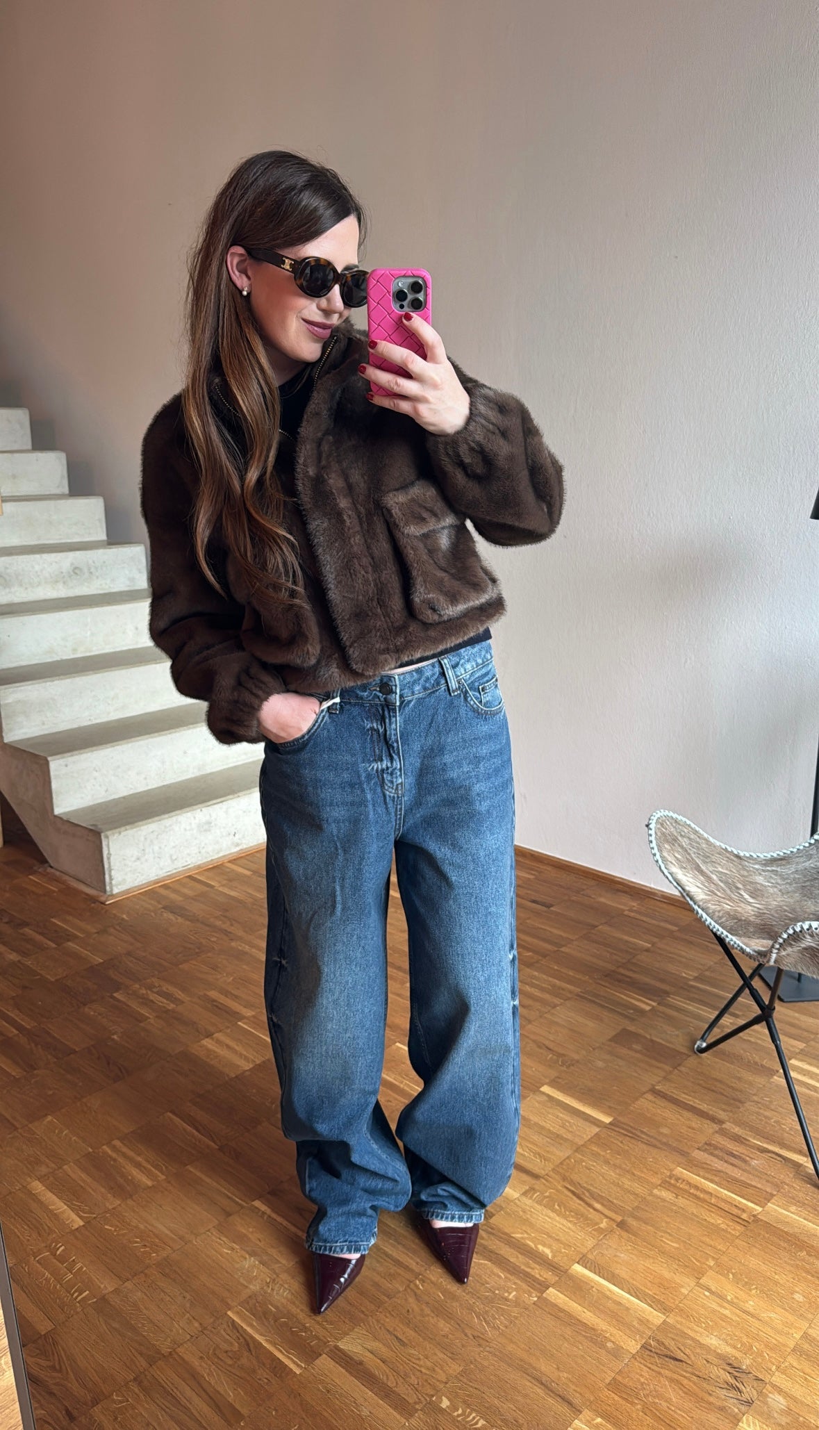 Diese verkürzte Fake-Fur Jacke in edlem Schokobraun überzeugt mit ihrem weichen Kunstfell und dem modernen, leicht verkürzten Schnitt. Die praktischen aufgesetzten Taschen und der sichere Reißverschluss sorgen für Komfort und Funktionalität. Aus 100 % Polyester gefertigt, bietet die Jacke ein warmes, zugleich stilvolles Tragegefühl – perfekt für kühle Tage. Das Modell trägt Größe S bei 164 cm und unterstreicht die elegante Passform. Ein vielseitiges Highlight für Ihre Garderobe, das edlen Look mit angenehmer Wärme verbindet.