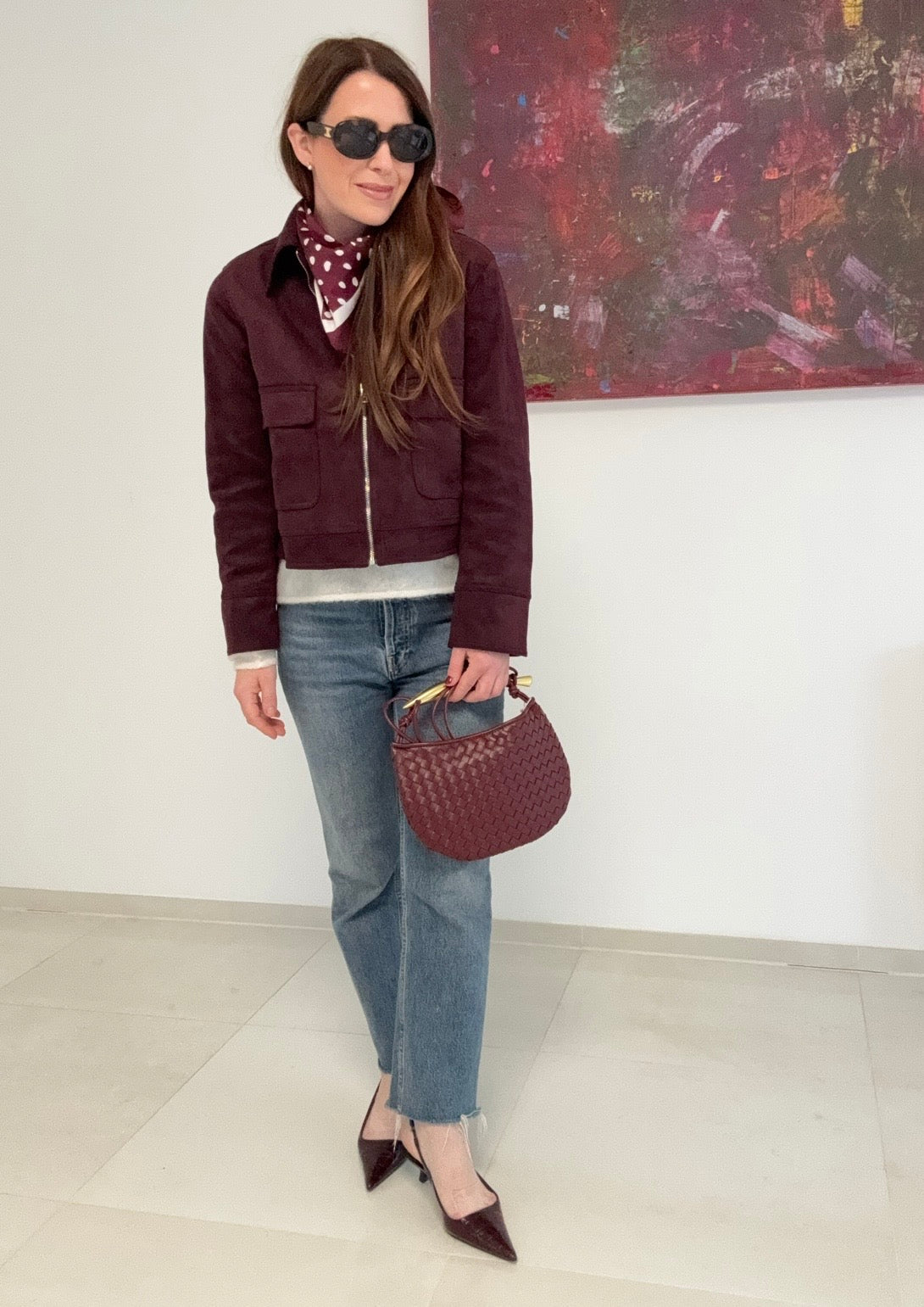 Diese verkürzte Jacke in elegantem Burgunder besticht durch ihren kastigen Schnitt und praktische aufgesetzte Taschen. Der Reißverschluss sorgt für einen modernen Look und einfachen Verschluss. Ideal für stilbewusste Frauen, die eine trendige und zugleich vielseitige Jacke suchen. Bei 164 cm Körpergröße passt die Größe S/M perfekt.