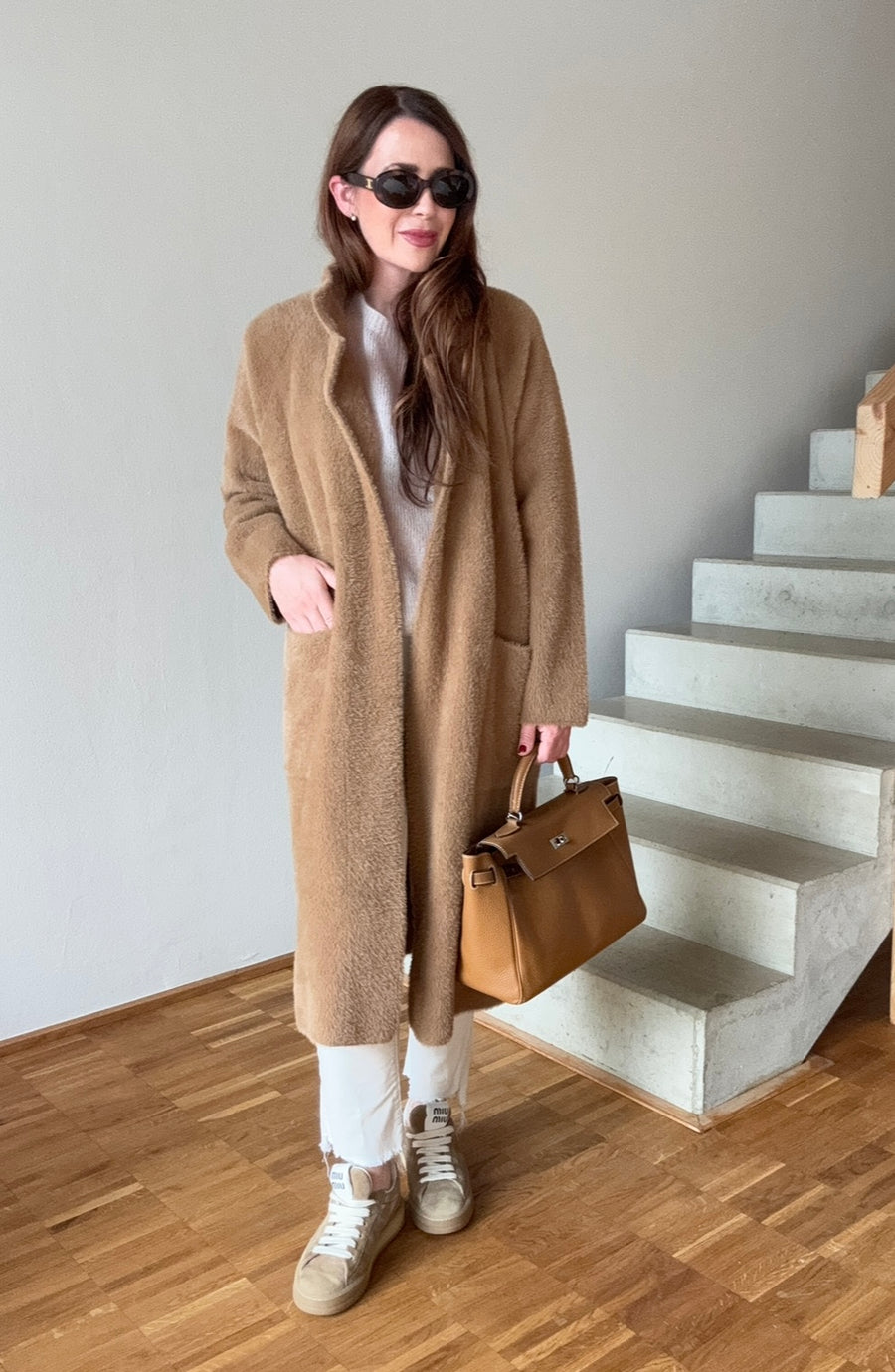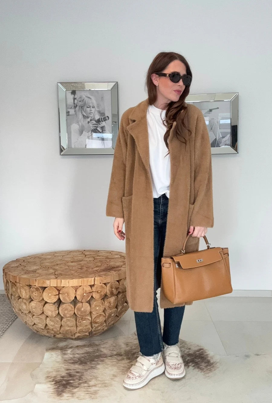 Dieser super weiche Midi-Mantel in angesagtem Camel überzeugt mit seinem flauschigen Material und sorgt für angenehmen Tragekomfort. Die praktische Midi-Länge und aufgesetzten Taschen machen ihn zum idealen Begleiter für kühle Tage. Die Einheitsgröße passt etwa von 34 bis 40 und bietet vielseitige Stylingmöglichkeiten. Kombinieren Sie ihn perfekt mit unserem Basic-Shirt in Weiß für einen modernen Look.
