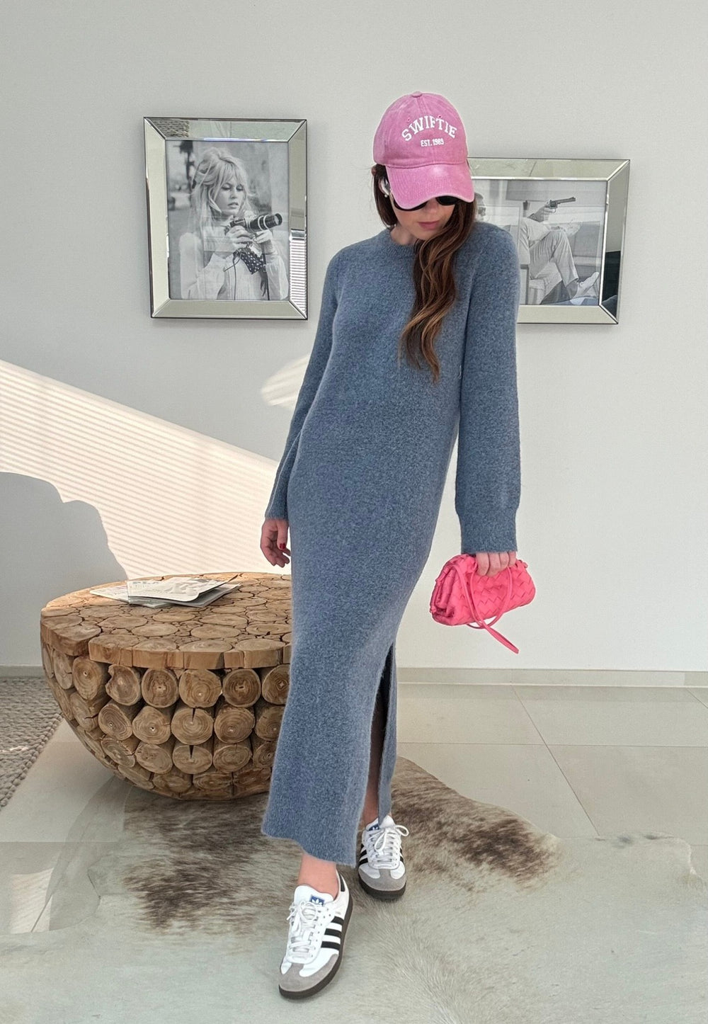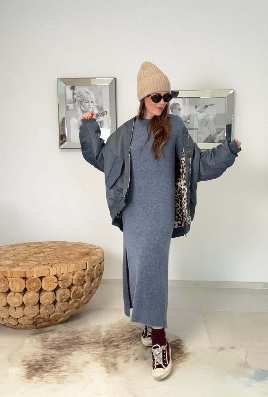 Langes Strickkleid mit Seitenschlitzen, welches schön lässig sitzt. Wenn man zwischen zwei Größen schwankt, sollte man zur kleineren Größe greifen.