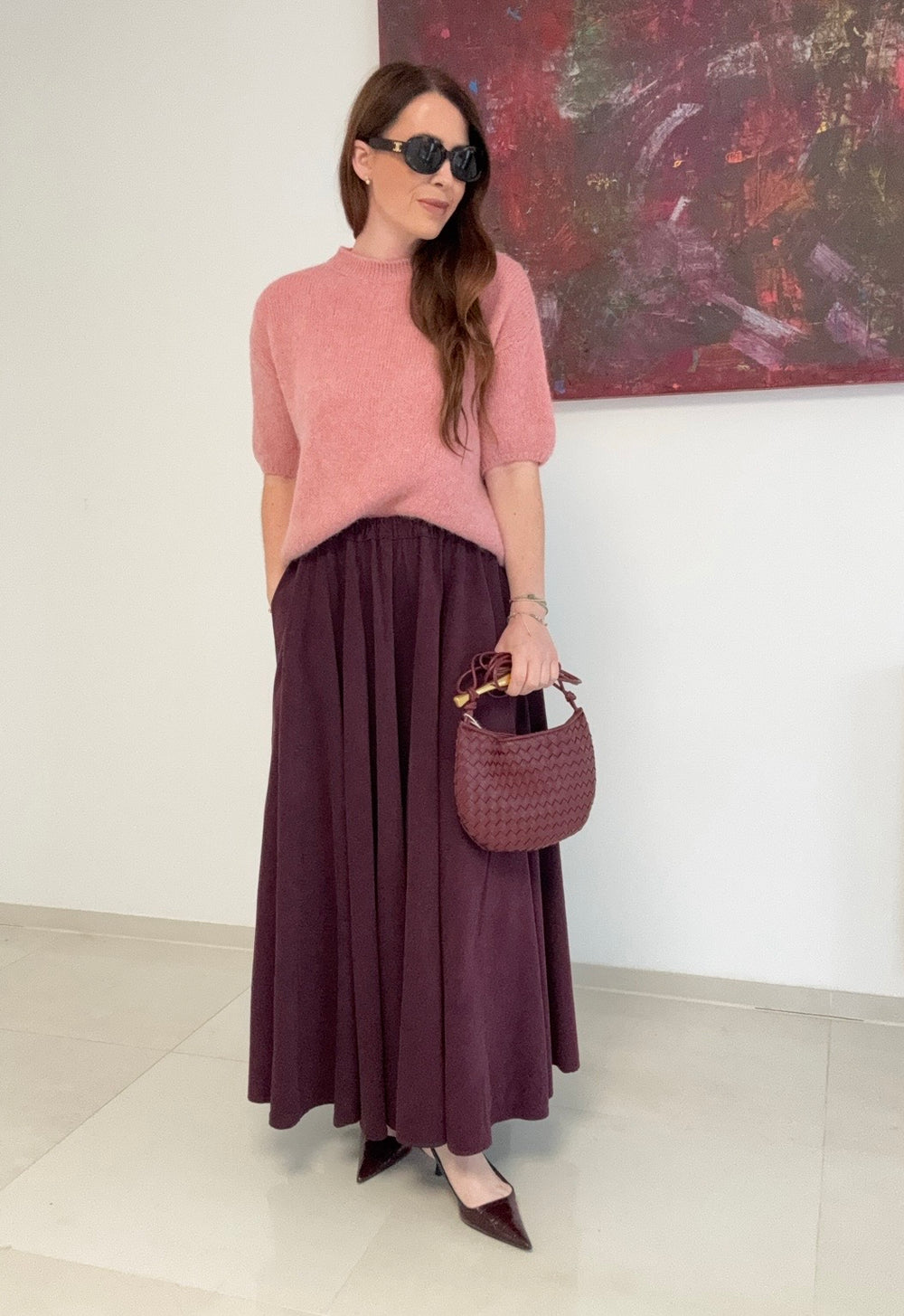 Dieses rosa Kurzarmshirt aus einer hochwertigen Materialmischung aus 52% Baby-Alpaka, 13% Leinen, 32% Polyamid und 3% Elastan bietet eine angenehme Kombination aus Weichheit, Atmungsaktivität und formbeständiger Elastizität. Die Einheitsgröße passt etwa den Größen 34 bis 40 und sorgt für eine flexible Passform, ideal für variable Tragekomfortansprüche. Das Modell auf dem Bild ist 164 cm groß und trägt Größe S. Ein elegantes Shirt, das Leichtigkeit mit edlen Naturfasern verbindet.