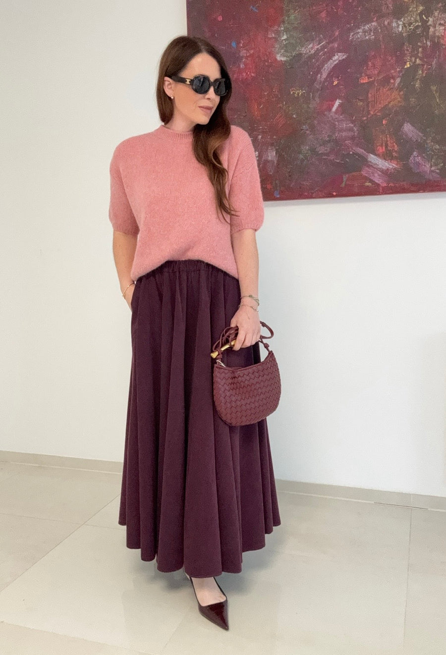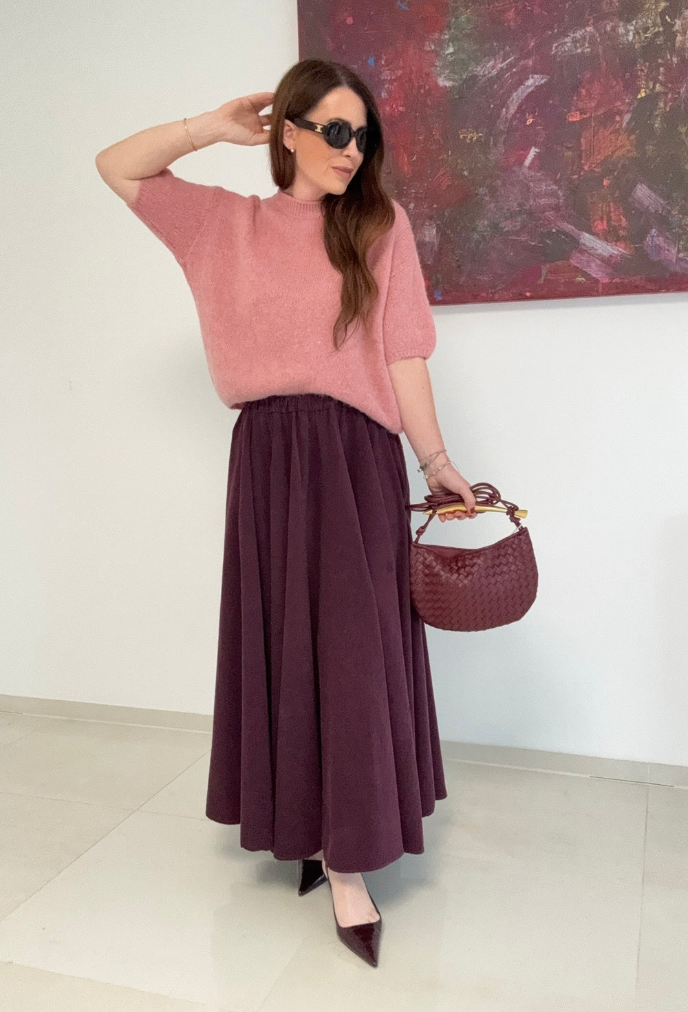 Dieser Baby-Cord-Rock in Burgunder bietet dank seines elastischen Bundes optimalen Tragekomfort und passt flexibel den Größen 36 bis 42 an. Die seitlichen Taschen verbinden Funktionalität mit stilvollem Design, während das hochwertige 100% Baumwollmaterial eine angenehme Haptik und Atmungsaktivität gewährleistet. Ideal für vielseitige Looks und unterschiedliche Anlässe. Das Modell auf dem Bild ist 164 cm groß und trägt Größe S.