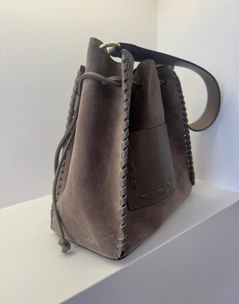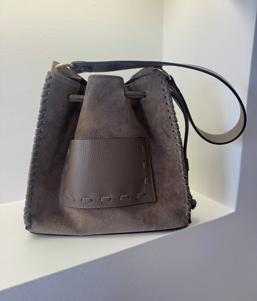 Dieser taupefarbene Lederbeutel mit goldenen Details und langem Riemen ist perfekt für den täglichen Gebrauch. Mit einer Größe von 26x27x12 cm bietet er ausreichend Platz für alle wichtigen Gegenstände. Das hochwertige Leder sorgt für Langlebigkeit und Eleganz. Tragen Sie ihn bequem über der Schulter oder als Crossbody-Tasche.