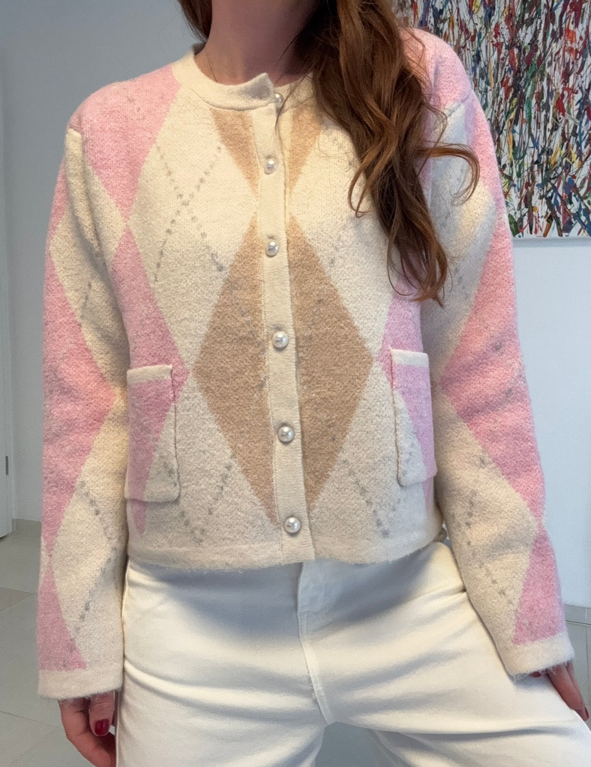 Eleganter Cardigan mit klassischem Rautenmuster in harmonischen Rosé- und Beigetönen. Das hochwertige Material aus 8% Wolle, 50% Viskose und 42% Polyamid bietet angenehme Wärmeisolation bei gleichzeitiger Atmungsaktivität und besticht durch seine seidige Weichheit. Die praktische Knopfleiste ermöglicht flexible Styling-Optionen. Die Einheitsgröße passt Konfektionsgröße 34 bis 40. Ein vielseitiges Layering-Piece für den modernen Kleiderschrank.