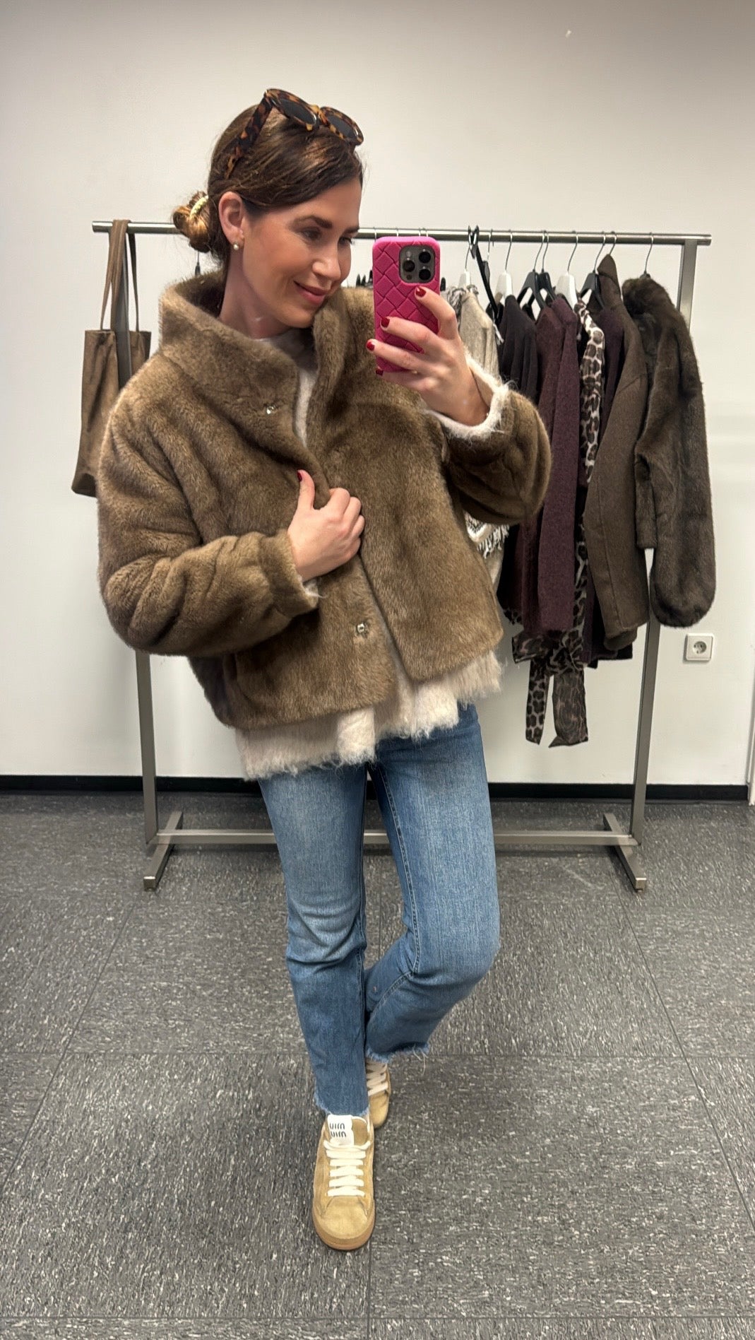 Elegante Fake Fur Jacke in warmem Beige mit praktischen seitlichen Taschen und silbernen Druckknöpfen. Das leicht verkürzte Schnittmuster schmeichelt der Figur und eignet sich perfekt für vielseitige Styling-Optionen. Die Einheitsgröße passt Größen 34-40. Modell 164 cm trägt Größe S. Hochwertige Verarbeitung für zeitlose Eleganz in der kalten Jahreszeit.