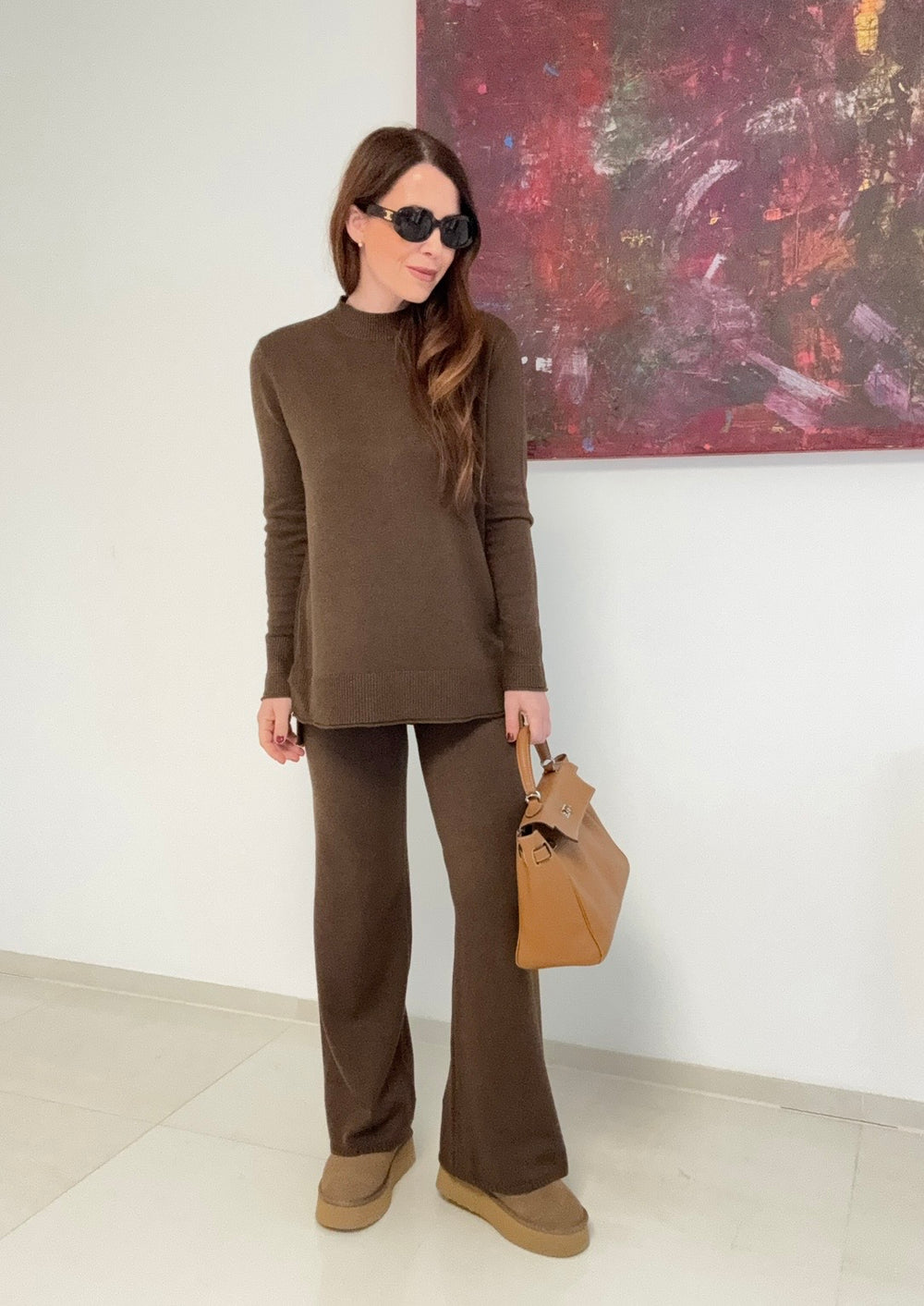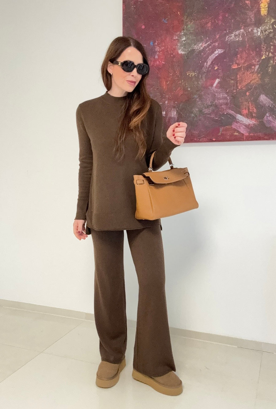 Dieser zweiteilige Set in elegantem Braun besticht durch seinen mini Stehkragen und besonders weiche Materialien. Die Kombination aus 55% Viskose, 30% Nylon und 15% Polyester sorgt für angenehmen Tragekomfort und optimale Passform. Dank der Einheitsgröße von ca. 34 bis 40 passt das Outfit vielseitig und schmiegt sich formgerecht an. Ideal für stilbewusste Frauen, die Wert auf Komfort und ein modernes Design legen. Das Model auf dem Bild ist 164 cm groß und trägt Größe S.