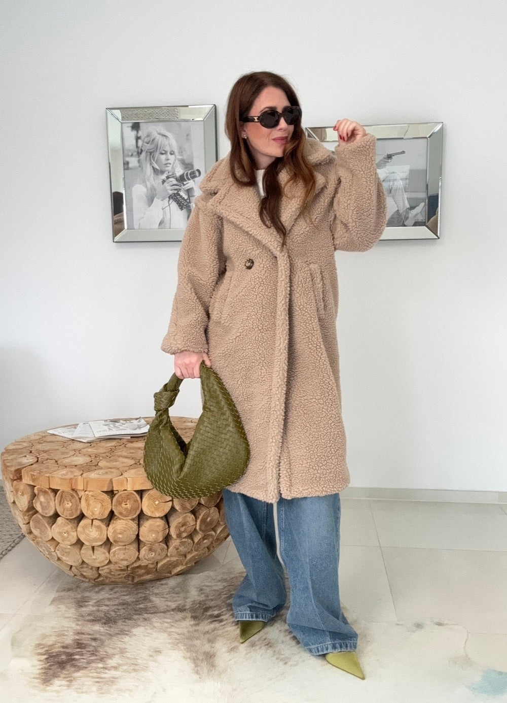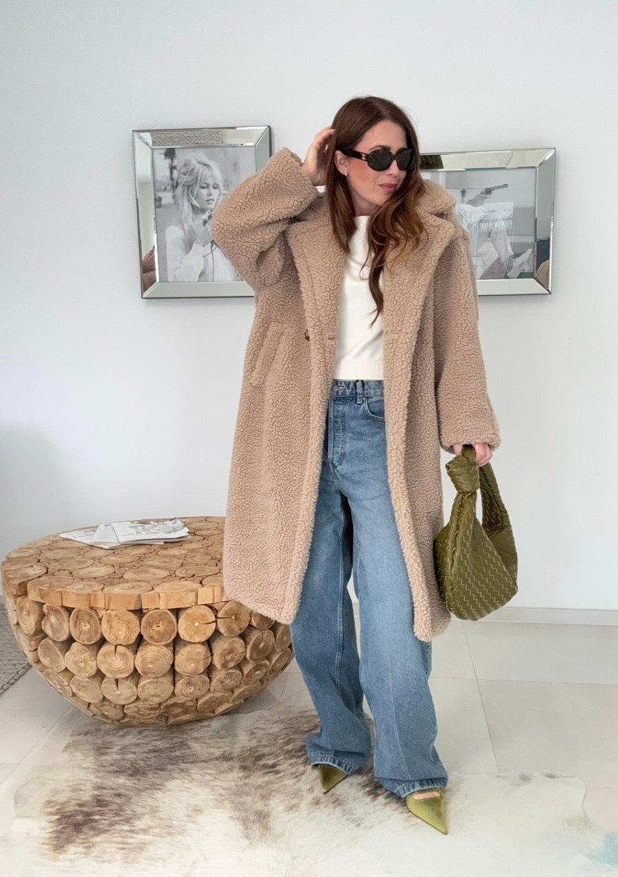 Ein super kuscheliger Hingucker für den Hebst und Winter. Der Mantel ist ein echtes It-Piece in Creme.