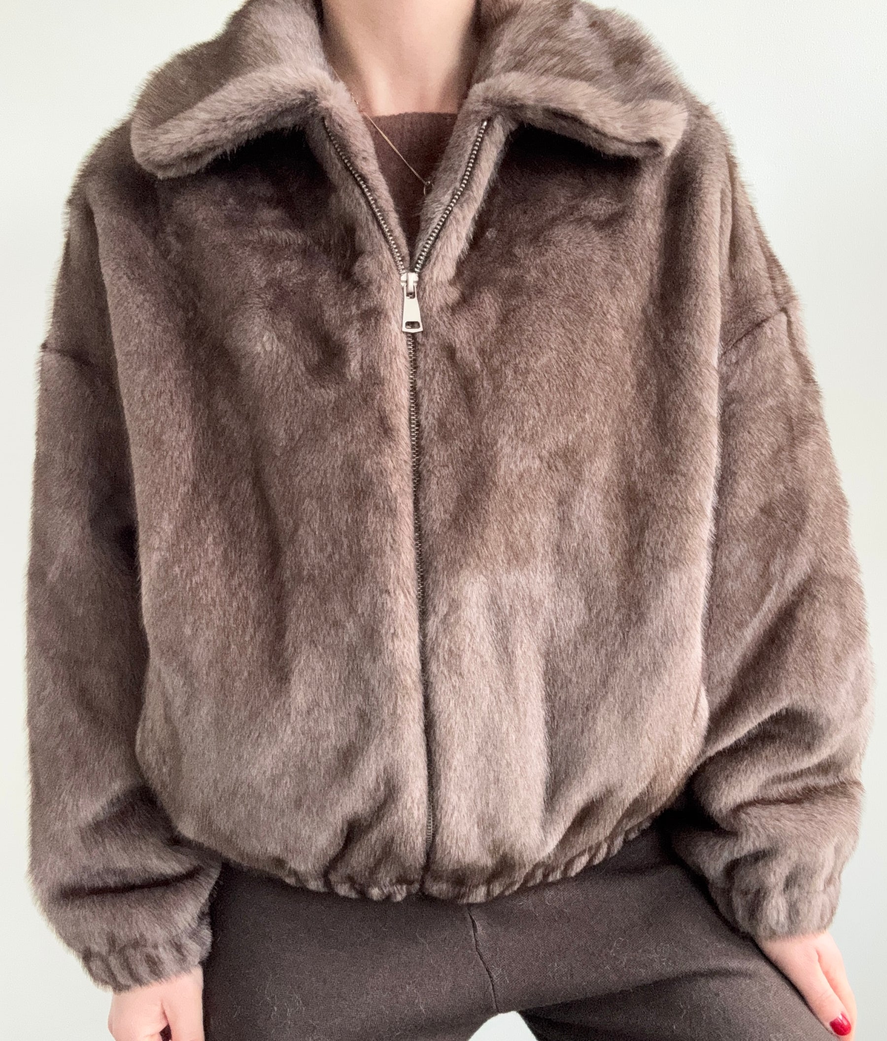 Diese Fake-Fur Jacke in Taupe verfügt über einen Reißverschluss und sitzt lässig, um einen modernen Look zu kreieren. Hergestellt aus künstlichem Pelz, bietet diese Jacke sowohl Wärme als auch Stil. Perfekt für den Alltag und besondere Anlässe.