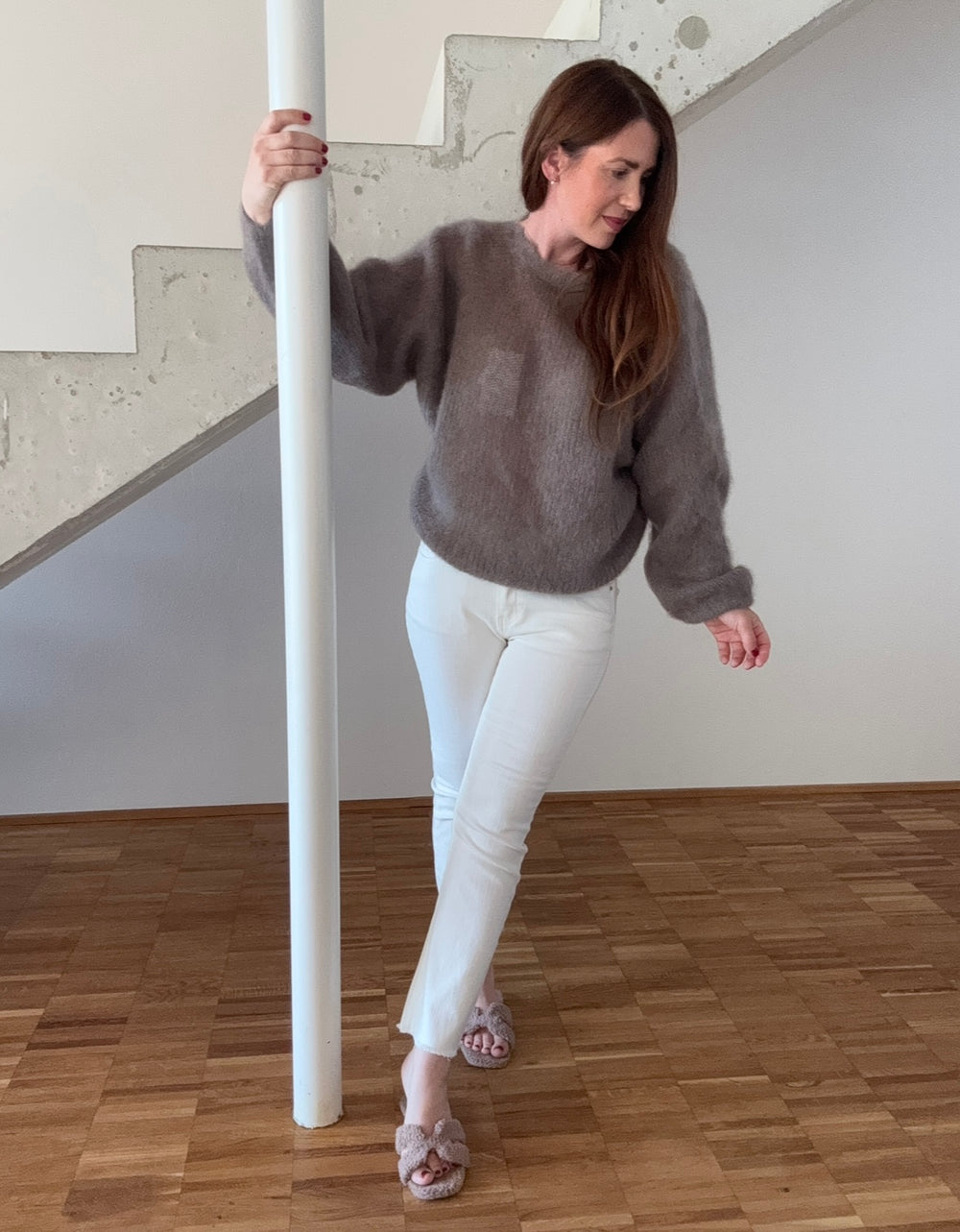 Dieser Wende-Mohairpullover in elegantem Taupe überzeugt mit seiner super soften Qualität und bietet dank beidseitigem Tragekomfort vielseitige Stylingmöglichkeiten. Die Einheitsgröße passt bequem von 34 bis 40 und sorgt für eine perfekte Passform. Ideal für alle, die Komfort und Stil in einem Kleidungsstück suchen. Die abgebildete Person ist 164 cm groß und trägt Größe S.