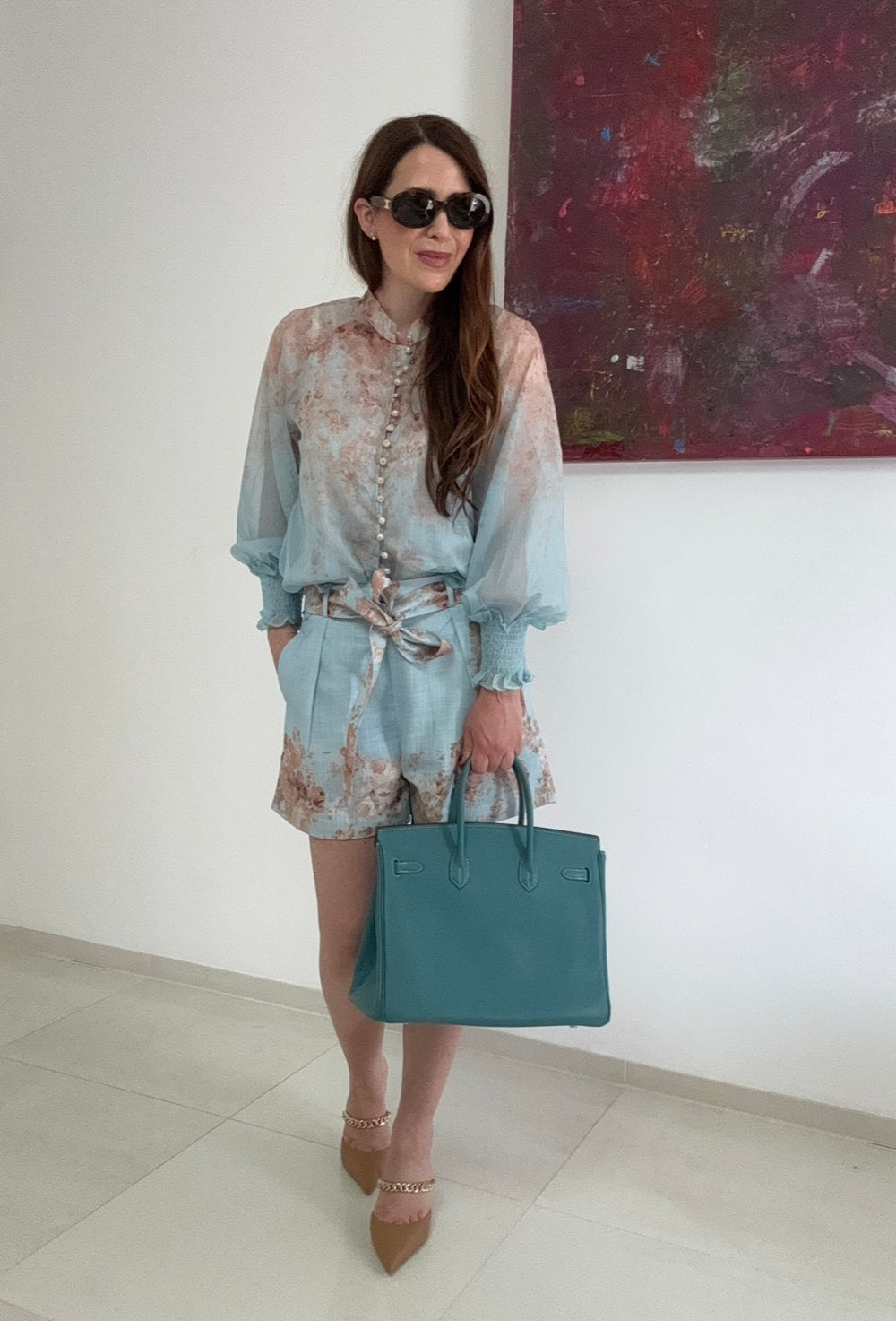 Dieser zweiteilige Look in frischem Blau kombiniert eine leichte Bluse mit Knopfleiste und passendem Unterhemd für angenehmen Tragekomfort. Die Hose mit abnehmbarem Gürtel sorgt für flexible Stylingmöglichkeiten. Die Bluse aus 100% Viskose fühlt sich weich auf der Haut an, während die Hose aus 70% Baumwolle und 30% Polyester für eine perfekte Passform und Langlebigkeit sorgt. Normal geschnitten, ideal für den Alltag oder besondere Anlässe. Das Modell trägt Größe S/M bei 164 cm Körpergröße.