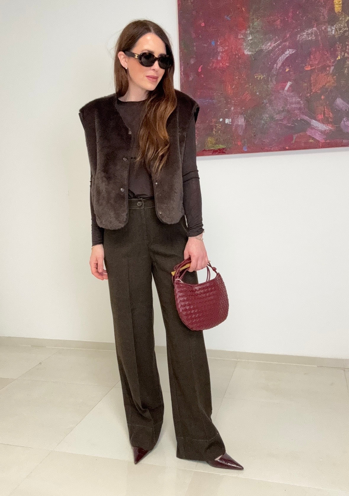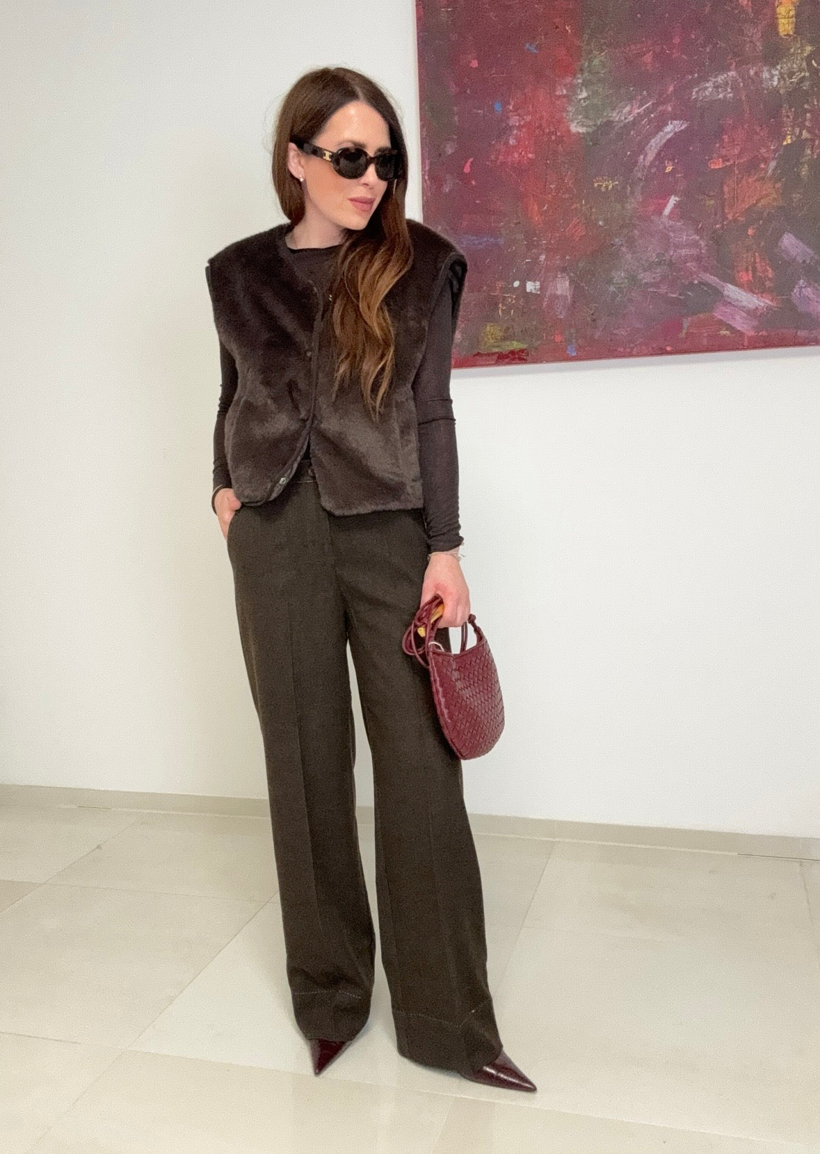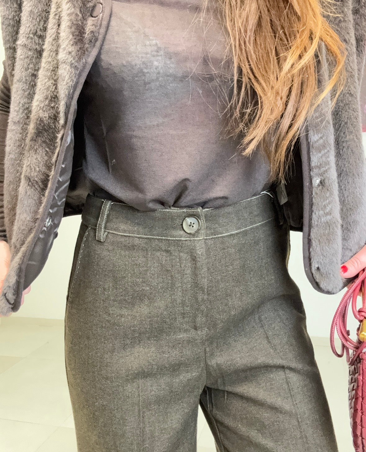 Elegante Stoffhose in klassischem Braun mit praktischen seitlichen Taschen und charaktervollen abgesetzten Nähten. Die hochwertige Materialmischung aus 79% Polyester, 18% Rayon und 3% Elastan sorgt für angenehme Tragekomfort und sanfte Haptik. Der Stoff fällt in normaler Passform und bietet optimale Bewegungsfreiheit durch den Elastananteil. Vielseitig kombinierbar für Alltag und Büro. Modelliert nach Größe S bei einer Körpergröße von 164 cm.